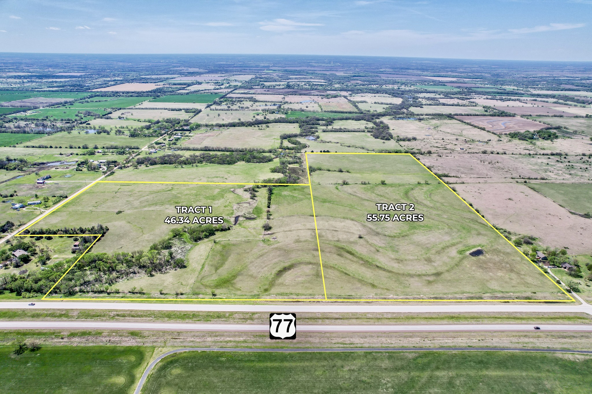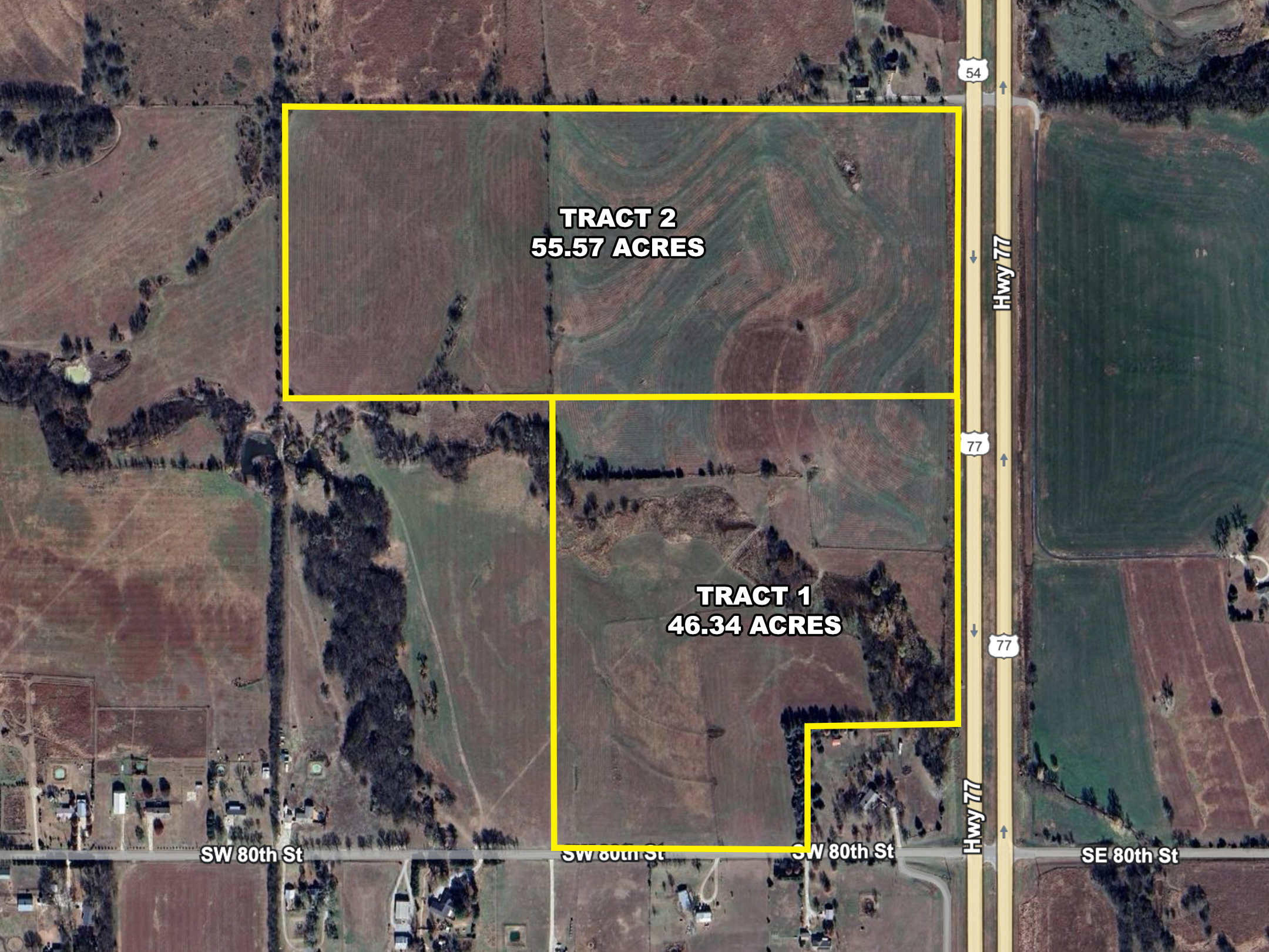 LAND HIGHLIGHTS: Excellent opportunity to purchase land south of El Dorado in Butler County, Kansas. Features includes a wet weather creek, small pond, trees, native pasture, brome grass. Access to Tract 1 is provided by township gravel road SW 80th St, while access to Tract 2 is located off blacktop HWY 77 in the northeast corner of the property. There appears to be good future pond building sites on each tract. Butler RWD #2 has a water line along the south boundary of Tract 1 and along the east boundary of Tract 2, offering the opportunity to obtain a rural water meter. Land in this area does not become available often, take advantage of this opportunity to Invest In Land!