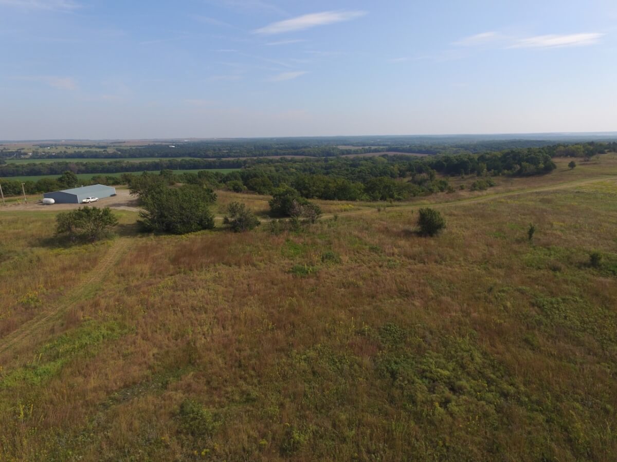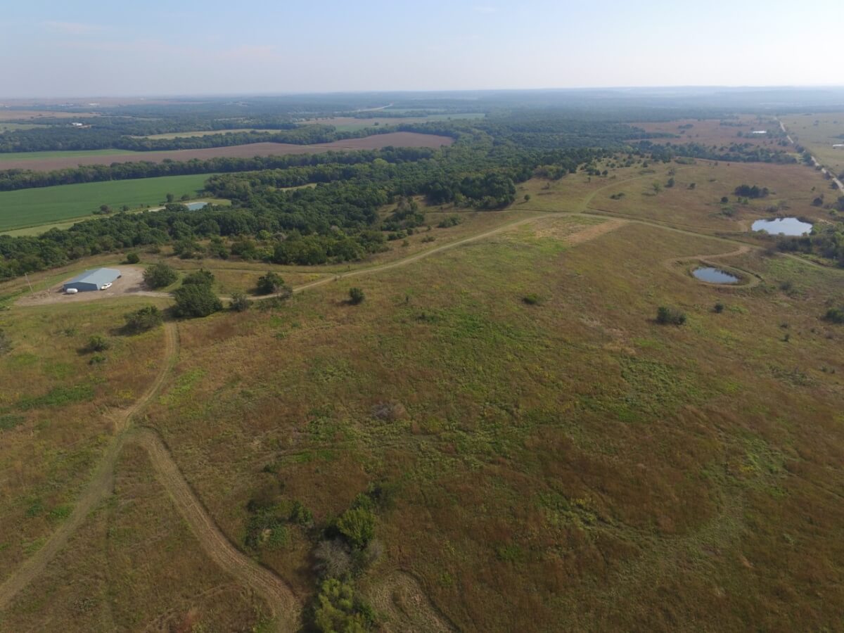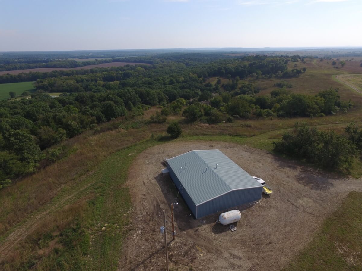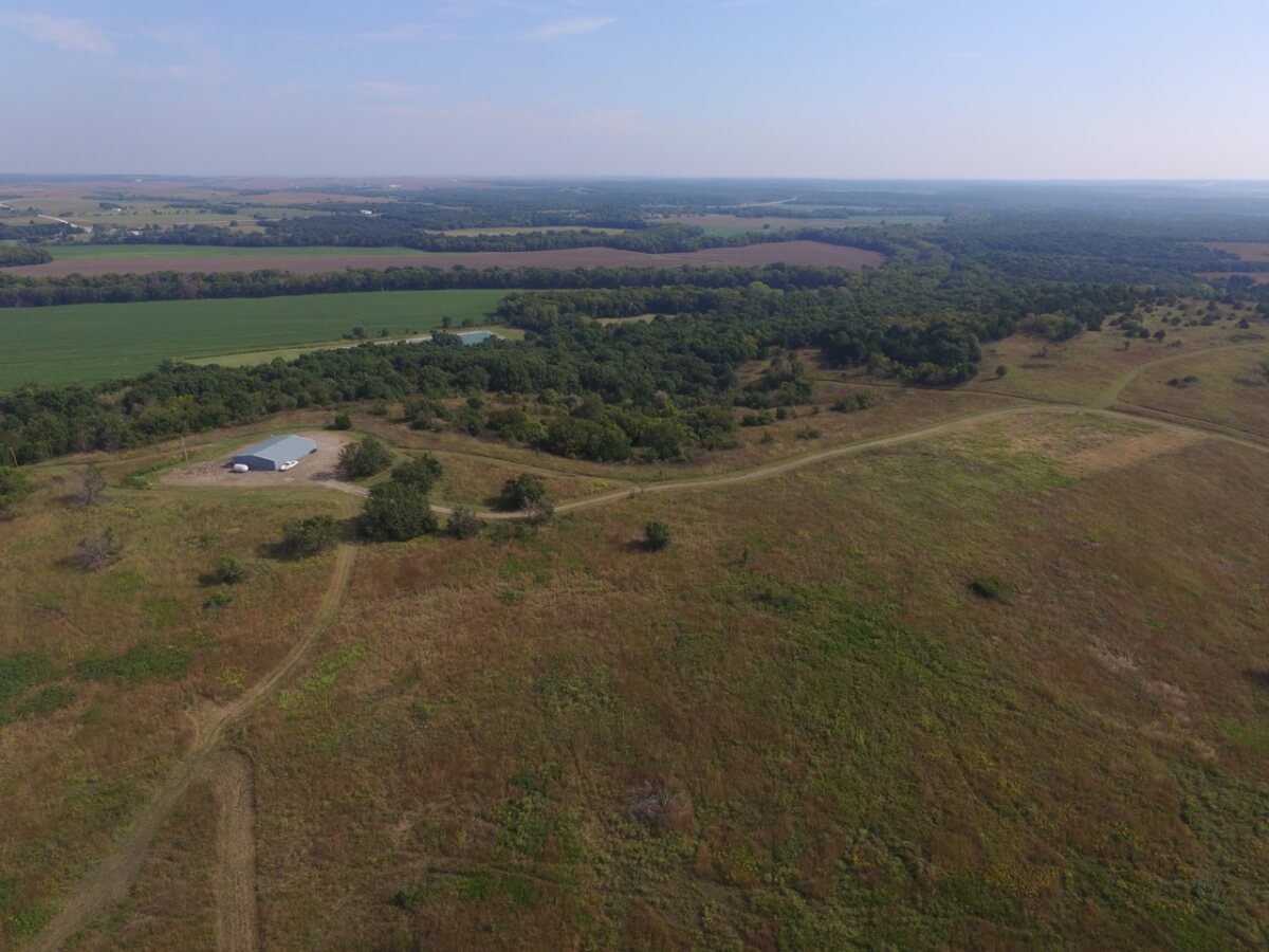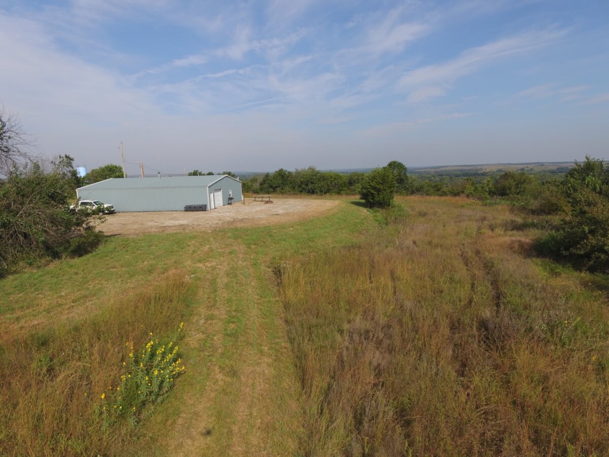 PROPERTY DESCRIPTION: 105+- acres located near Fall River in Greenwood County and Elk County, Kansas. It all starts with the perfect hunting lodge! This 2 bedroom 1 bath red steel frame 50′ x 60′ metal building is equipped with rural water, a 3000 gallon propane tank, wood heat, central heat and is fully insulated. The finished living area also includes a nice open kitchen/living room area with eating bar, and a formal eating area. Perfectly set up for a weekend getaway or lodge. The metal building also has plenty of room for parking and storage. You won’t find a more scenic setting! The view is breathtaking. If hunting and recreation are your desire, you will love this property. Extremely large elevation changes with thick heavy timber are present on the north half of the property. The south half features three ponds, scattered timber, and 8’+ tall native Bluestem Grasses perfect for wildlife bedding areas. While the property is very quiet and secluded, access is excellent with less than 1/2 mile of gravel road. Greenwood County and Elk County are well known for their trophy Kansas Whitetail Deer. Local features include Flint Oak, known as “America’s Premier Hunting Resort.” You can learn more about Flint Oak by visiting their website.