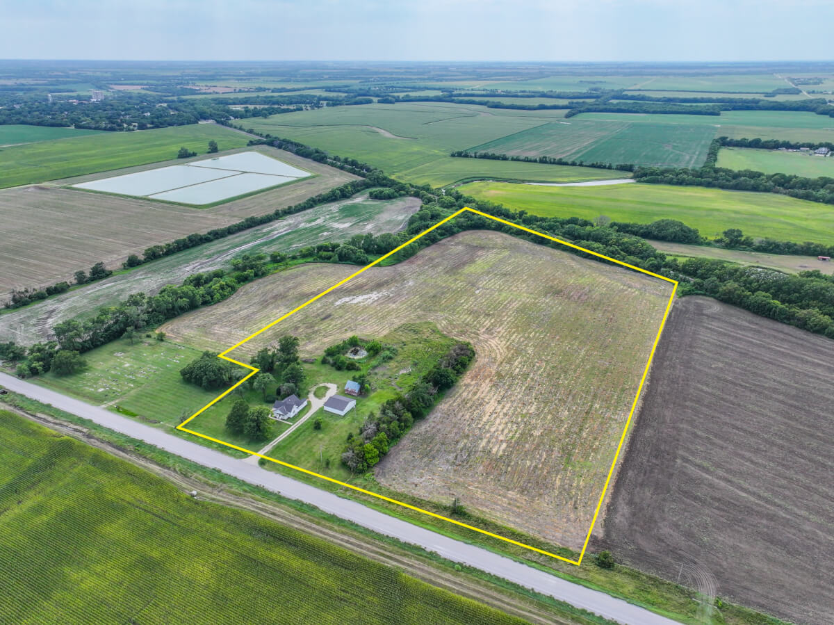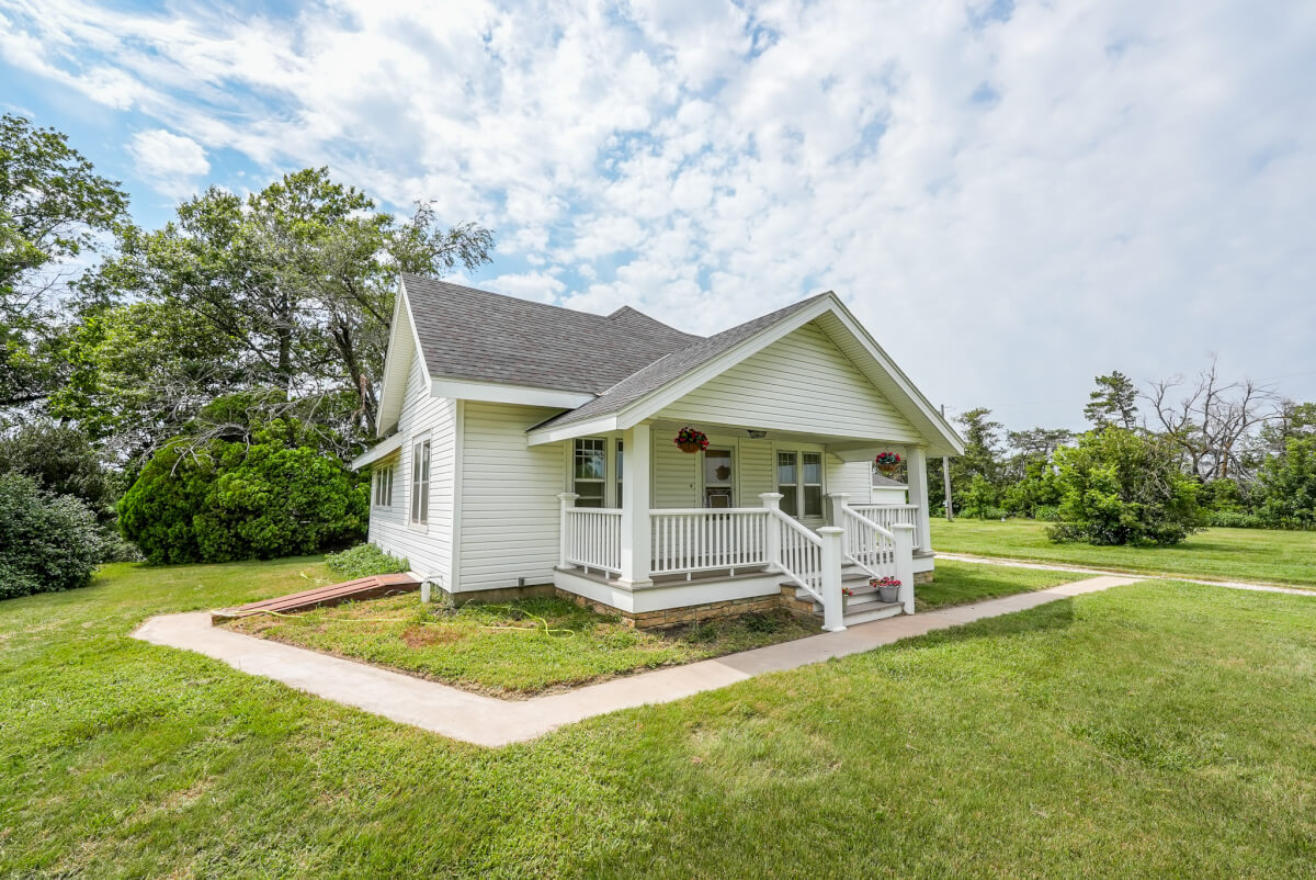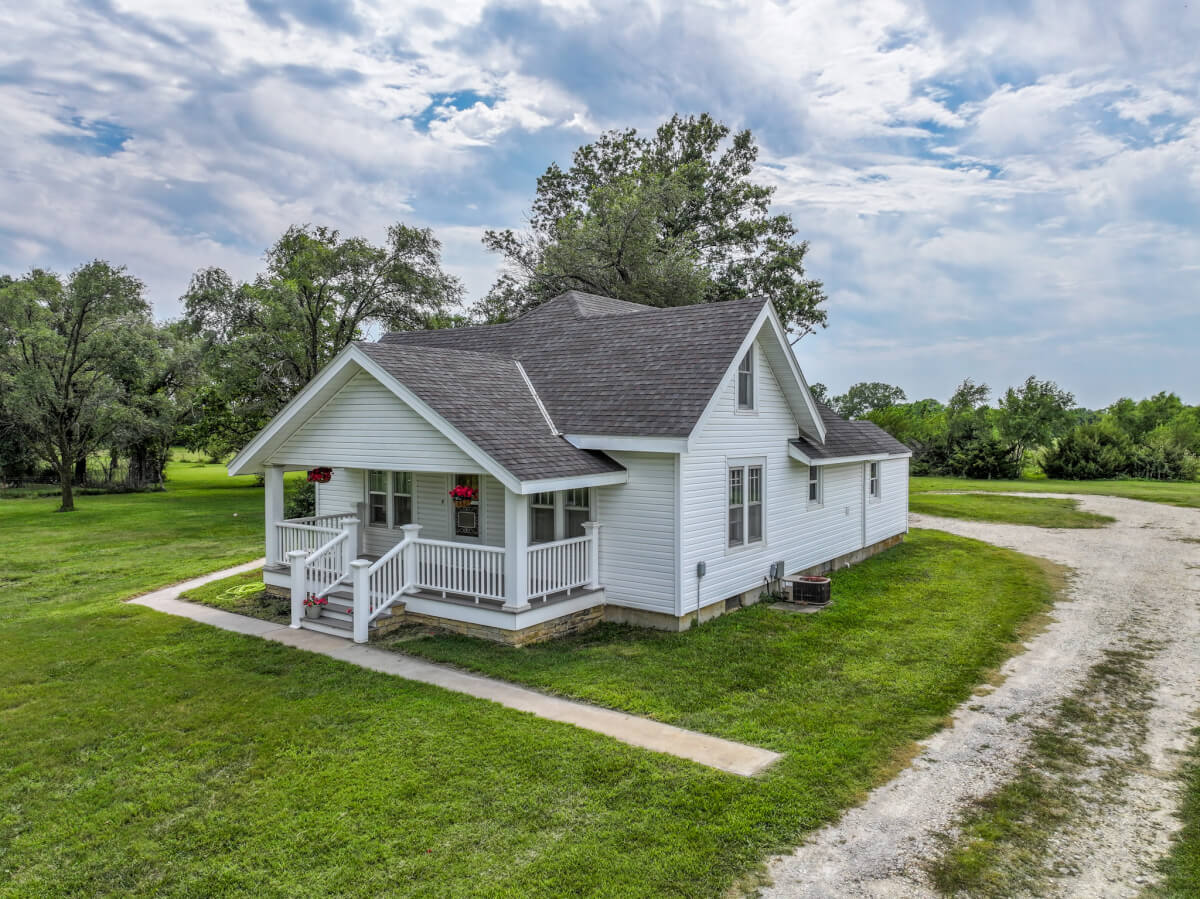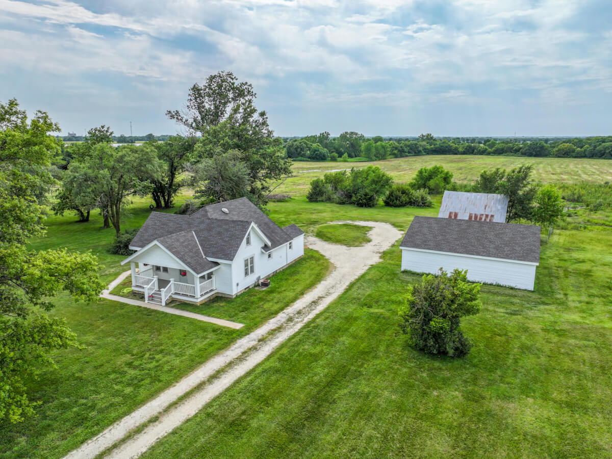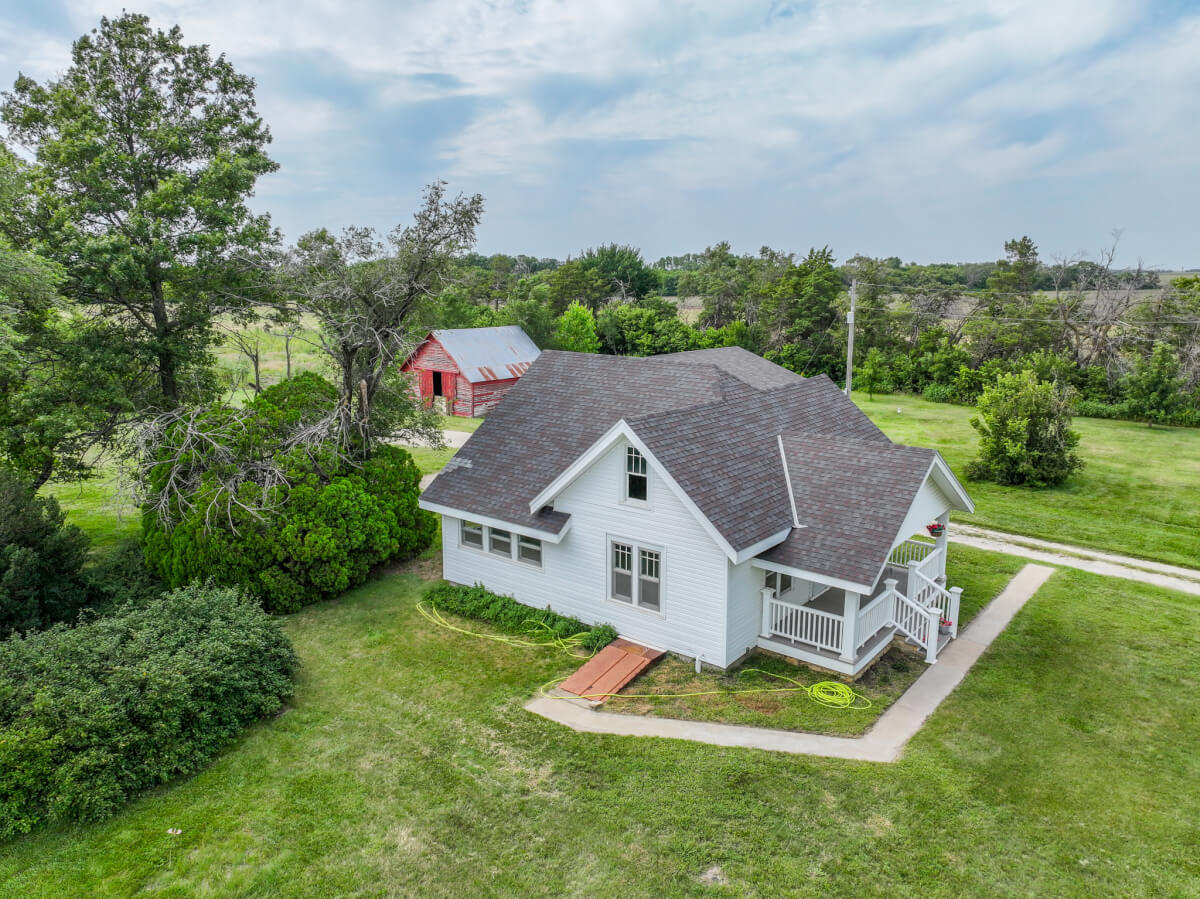 PROPERTY DESCRIPTION: Farm house and buildings on 20+- acres just north of Whitewater in Butler County, Kansas. The house could be used as a 2 or 3 bedroom. There are 2 full bathrooms, one on the main level, and the other is upstairs servicing the master bedroom. Total finished living area is 1,703 square feet. Many upgrades have been added over the years, including a modern foundation and electrical. The house sits on a full unfinished basement. Buildings include a 36′ x 36′ detached garage with a concrete floor and a 24′ x 24′ red barn. Approximately 15.6 acres of the land is tillable farm ground. Several nice trees are present on the property, including several large mature quality trees in the immediate yard, a good shelter belt of trees to the north of the house, and a highly productive pear tree! Utilities on the property include a water well, lagoon, and propane. Here is a great opportunity to live in rural Butler County, Kansas near Whitewater with blacktop access, great views, and country living!