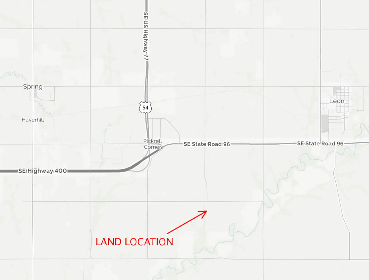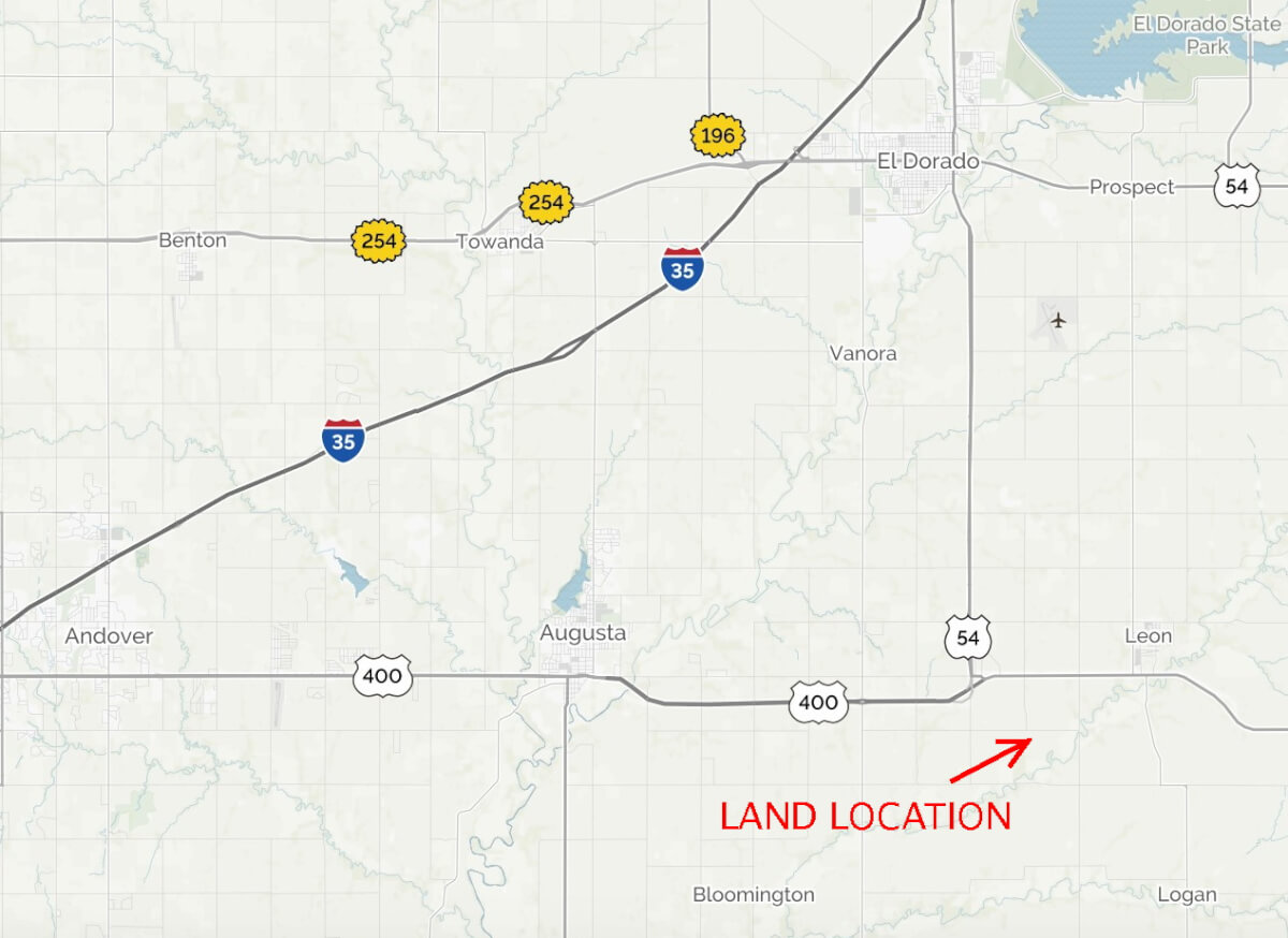 LAND LOCATION: From Leon Ks, West on HWY 400 2 Miles to Turkey Creek Rd, South 1 Mile to the property is the access from the North. From HWY 400 East of Augusta, South 1 1/2 Miles on Haverhill Rd to 120th, East 2 3/4 Miles to the property is the access from the South.