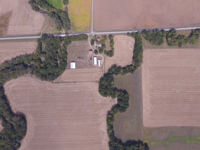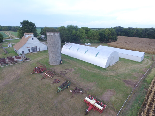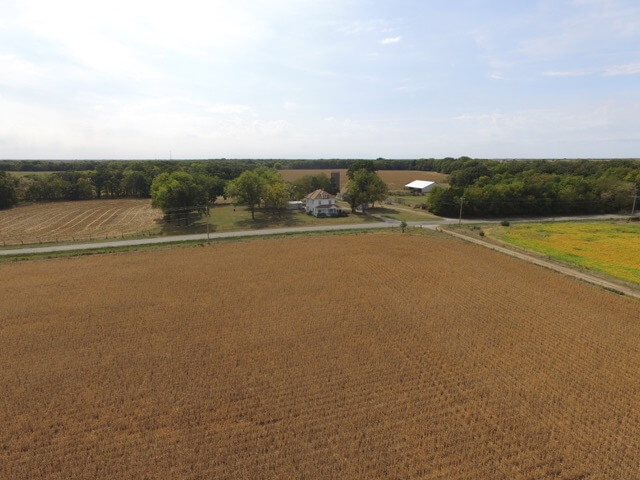 IMPROVEMENTS:  A beautiful white two story farm house built in 1911 is centrally located on tract 1.  This lovely home was built in 1911 and features original oak trim and doors, tall ceilings, and Youngstown by Mullins metal kitchen cabinets.  The main floor consists of the kitchen, formal dining room, living room, 1 bedroom and 1 full bath.  The second story has 4 bedrooms and 1 full bath.  You will love the beautiful Oak stairway and bannister, the secret butler stairway, and the large wrap around porch along the north and west side of the house.  The interior doors are all original with the original door knobs.  Other improvements include a 24′ x 24′ metal garage building, historic Granary built in 1947, 100′ x 44′ Quonset, 80′ x 64′ hay/livestock barn, livestock scales, silo, and several other utility outbuildings.