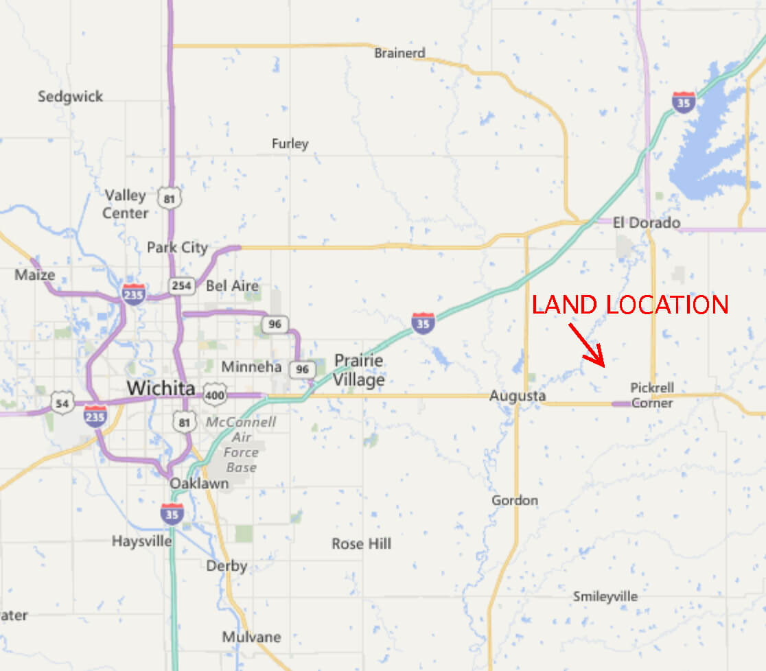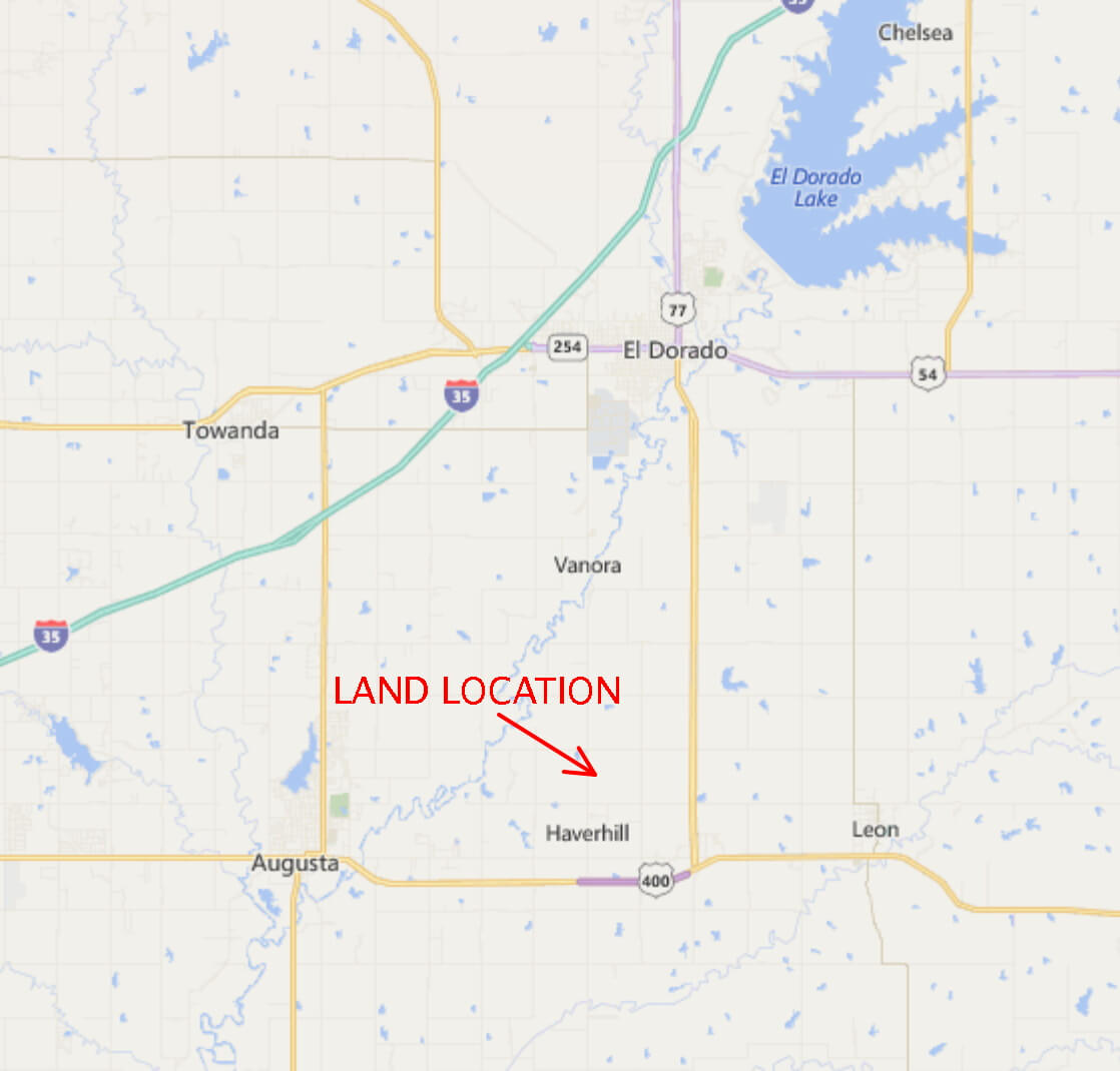 LAND LOCATION: From Augusta Kansas, East on HWY 54/400 5 Miles to Haverhill Rd, North 3 1/2 Miles to the property OR From El Dorado, 7 Miles South on Haverhill Rd.