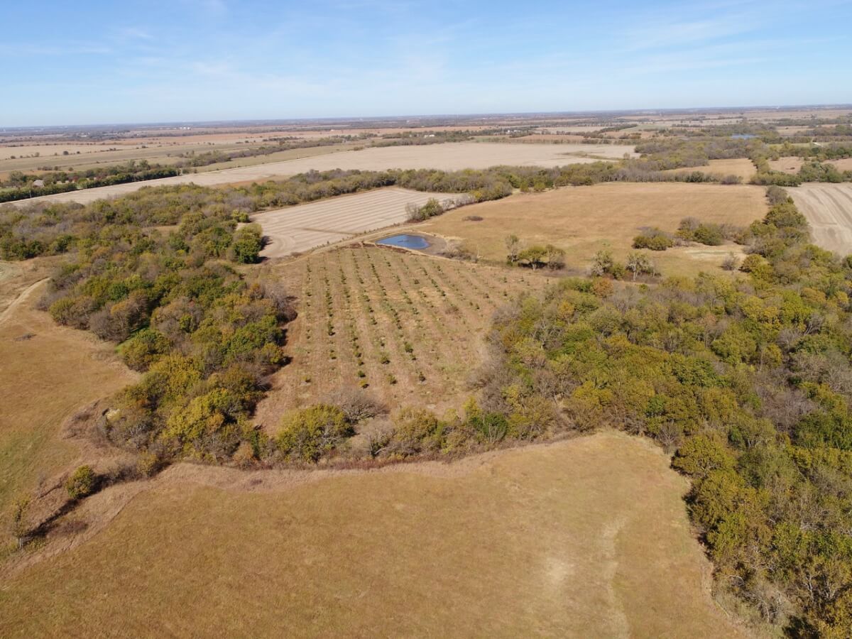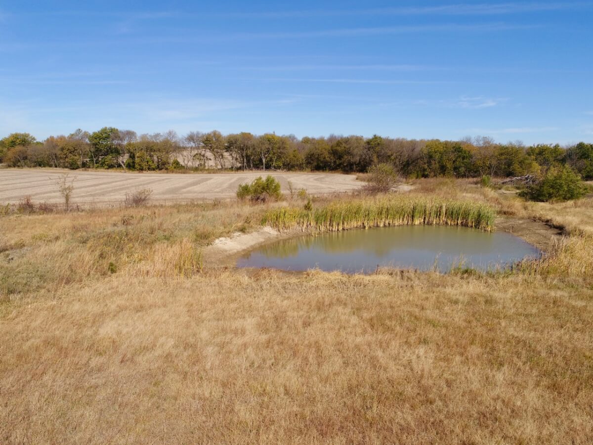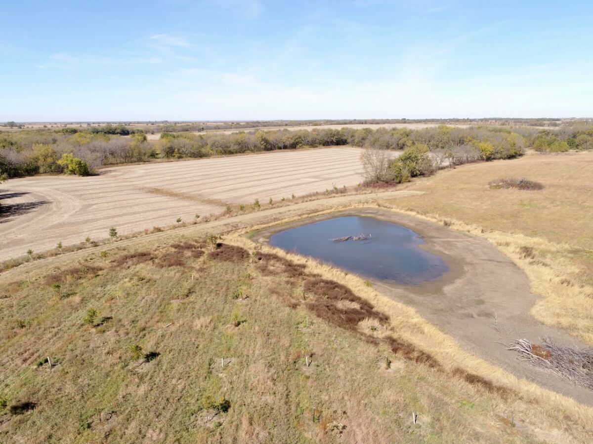 PROPERTY DESCRIPTION: 140+- acres with a balance of tillable, native hay meadow, 5 stocked ponds, timber, and over 1/2 mile of Rock Creek.  There is also another creek that joins Rock Creek near the center of the property.  On the north portion of the property, there is a water well rated at 20 gallons per minute.  100’s of mature native Walnut trees and 1000’s of young native Walnut trees are present along the creeks.  In addition to the many other native trees, there are 7 varieties and 1000+ Oak trees, 250 Pecan trees, 50 Chestnut trees, 250+ Apple trees, Native & American Plums and Native River Grapes.  Two timber stand improvements have been performed with the Kansas Forest Service in 2007 and 2017.  Other conservation projects have included waterways, terracing, and stream bank stabilization.  The 34+- acres of tillable ground was planted to Soybeans in 2017.  Abundant wildlife includes Kansas Whitetail Deer, Turkey, and Quail.  A spring in the creek has never gone dry during the current ownership.