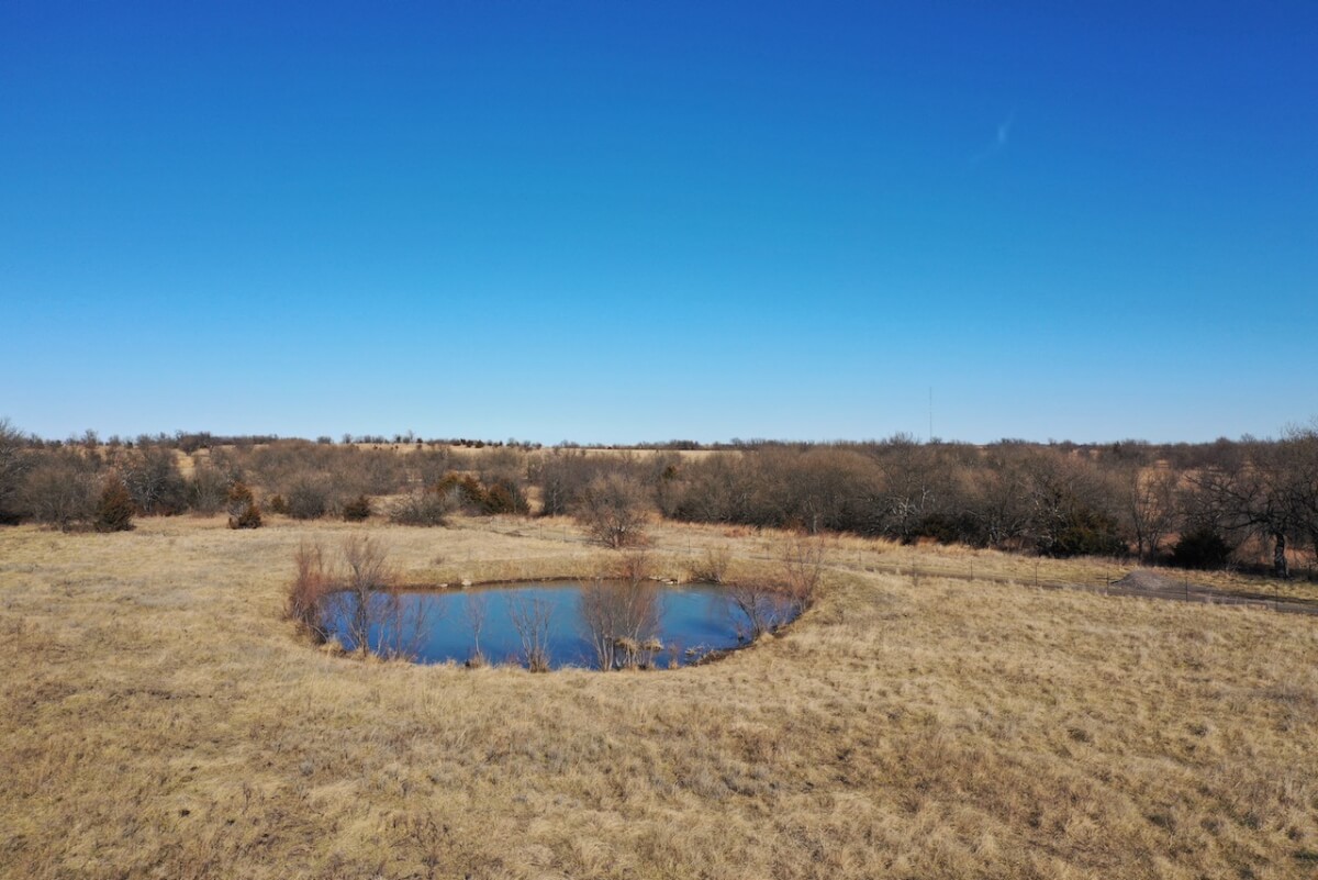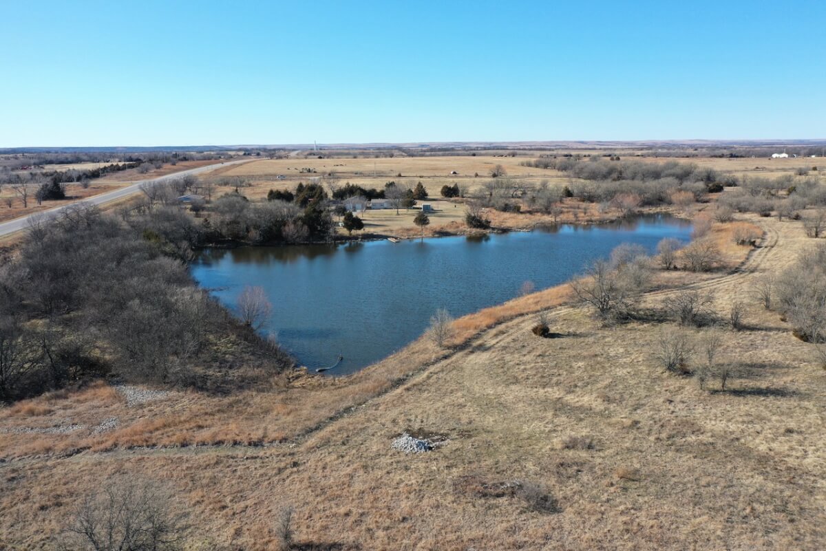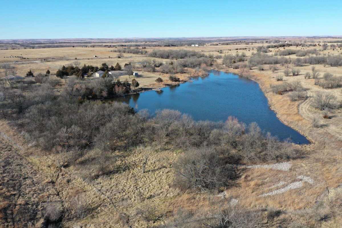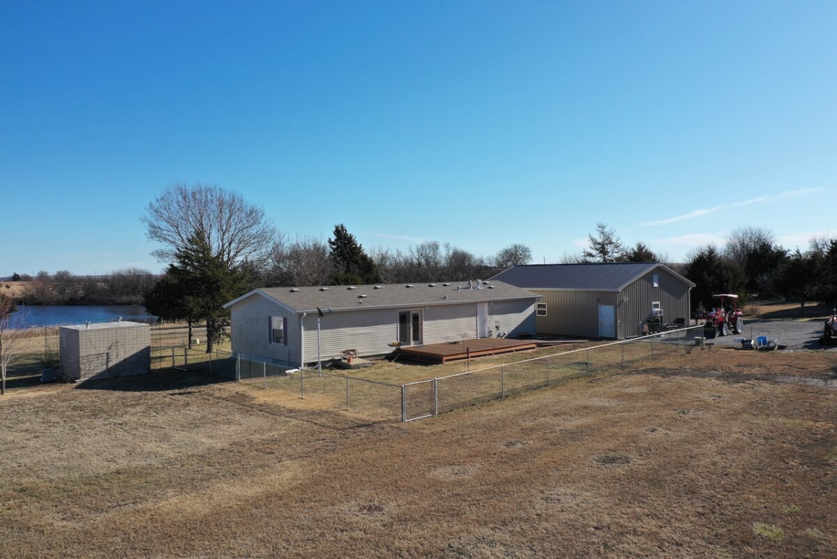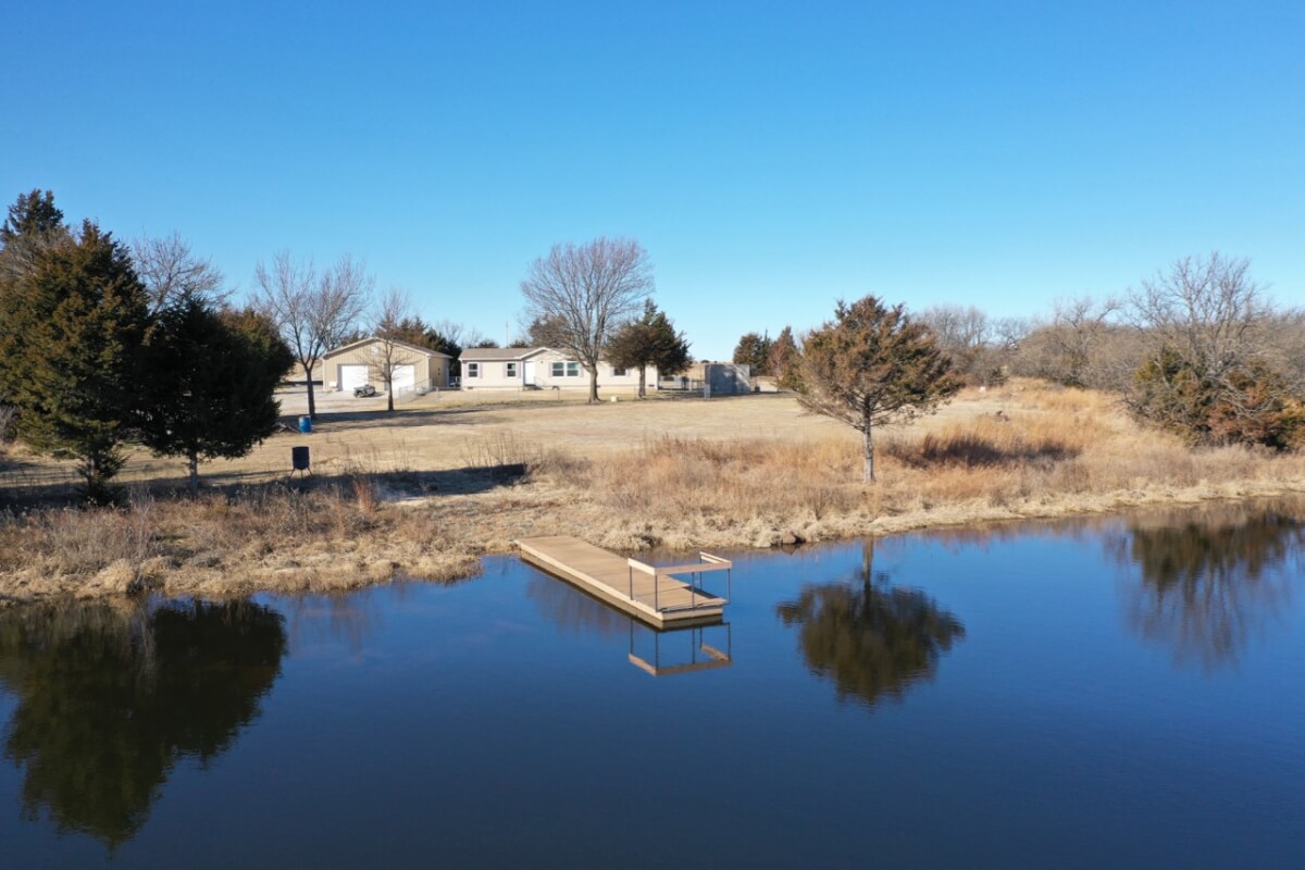 PROPERTY DESCRIPTION: 153+- acres of excellent diverse Greenwood County Kansas land with a house & garage. The land consists of a 4 Acre stocked Lake and 4 additional small ponds. According to the Seller, the lake measures 17′ deep during normal conditions. Enjoy time on the permanent dock! Scattered timber and pasture provide excellent food and cover for both livestock and wildlife. Fences range from average to new. The manufactured home on a permanent foundation has 1392 square feet of finished living area and was built in 2013. It has 3 bedrooms, 2 full bathrooms, and will include all of the appliances. Utilities include rural water, septic with laterals, an owned 500 gallon propane tank, and a Generac generator backup system. The detached garage has an oversized 2 car parking area with 2 overhead doors, plus an additional space for an office or workshop area. A 10′ x 10′ above ground concrete tornado shelter with 10″ thick walls sits to the northeast of the house. There is also a reconstructed pole barn for hay or equipment storage. What a great opportunity to have a lake front house with good livestock pasture and hunting for Kansas Whitetail Deer, Quail, Ducks, Geese, and Turkeys!