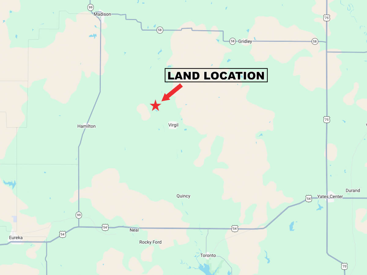 LAND LOCATION FROM VIRGIL: 1 mile west and 1 mile north on Virgil Rd, keep going north/northeast on DD Rd (becomes 275th) 1 mile.