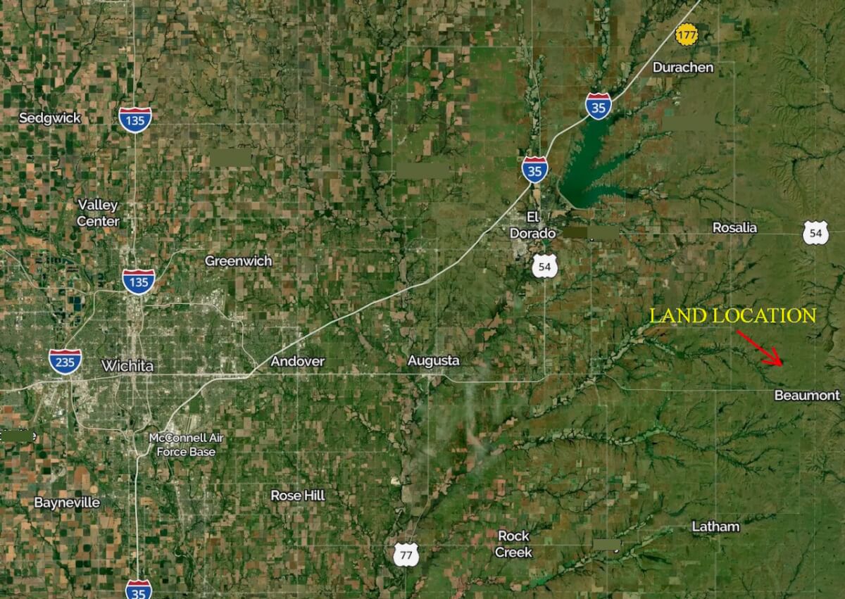 LAND LOCATION: From Leon, Kansas east on HWY 400 10 miles to SE Gray Rd., north 2 miles to SE 90th St., east 1 1/2 miles to the property