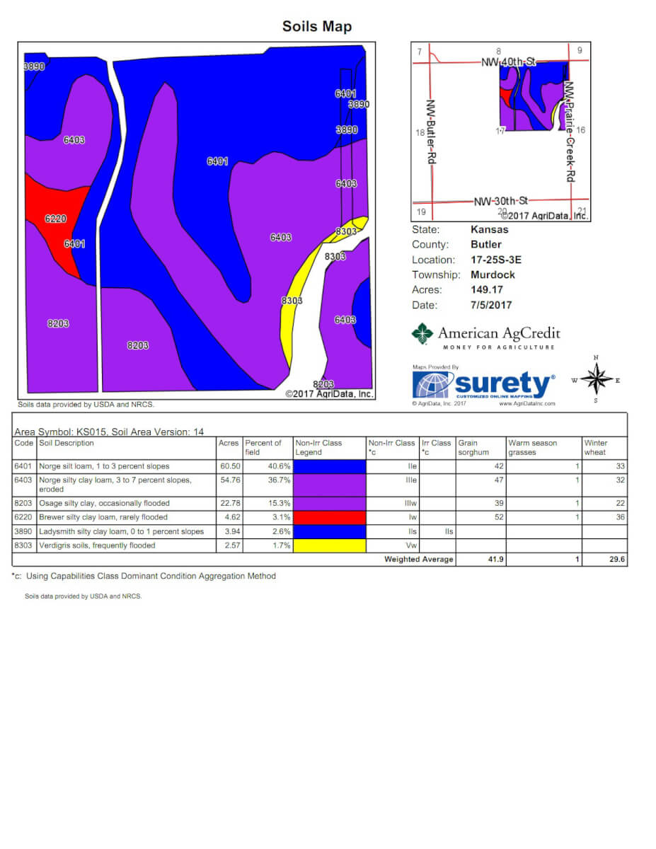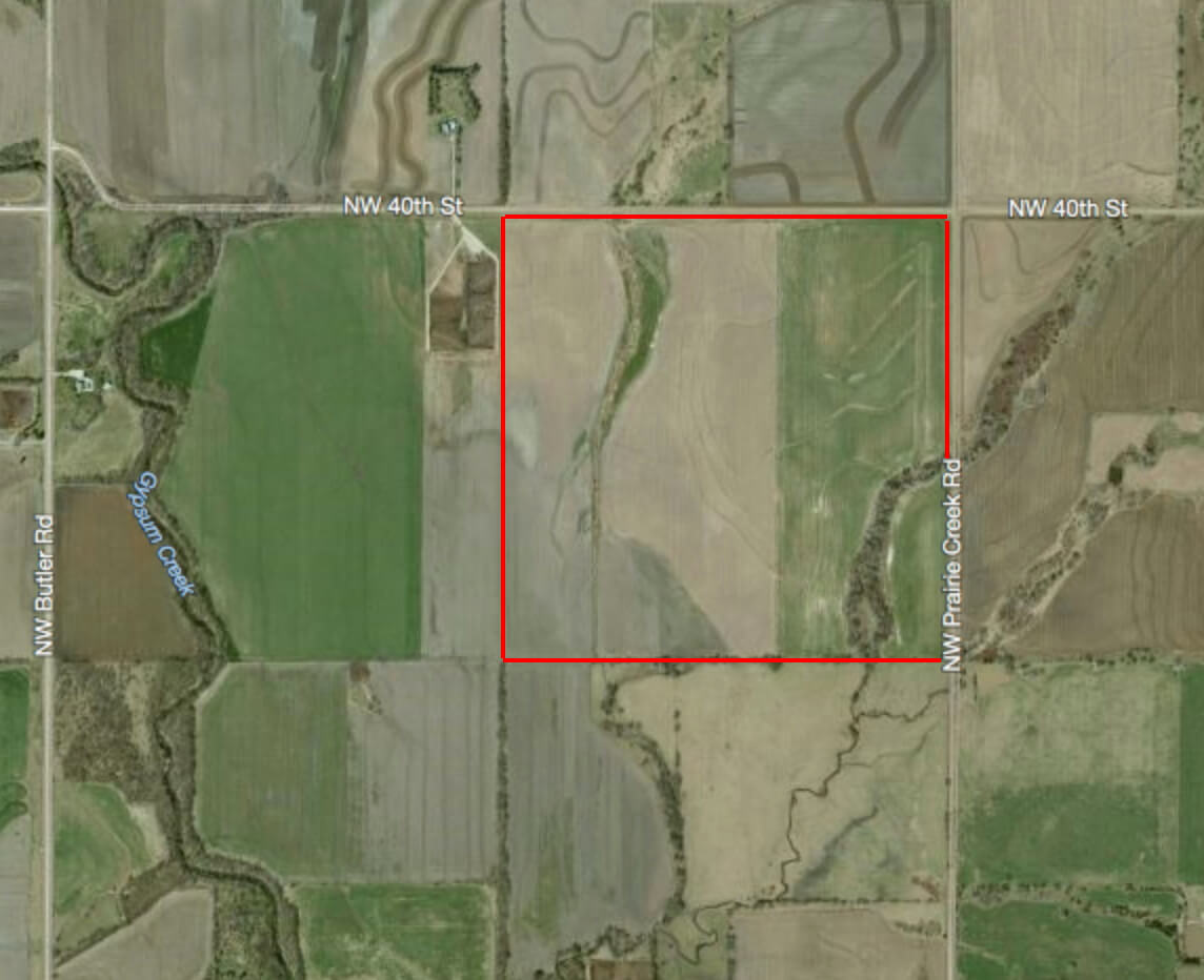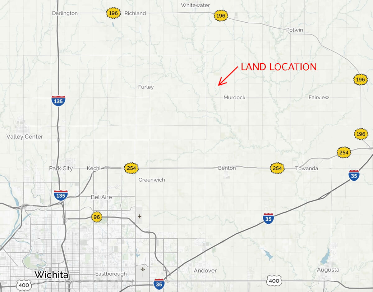 LAND LOCATION: From Whitewater Kansas, 5 miles South on Butler Rd to NW 40th St, East 1/2 Mile to the property OR from HWY 254 West of Benton, 6 miles North on Butler Rd to NW 40th St, East 1/2 Mile.