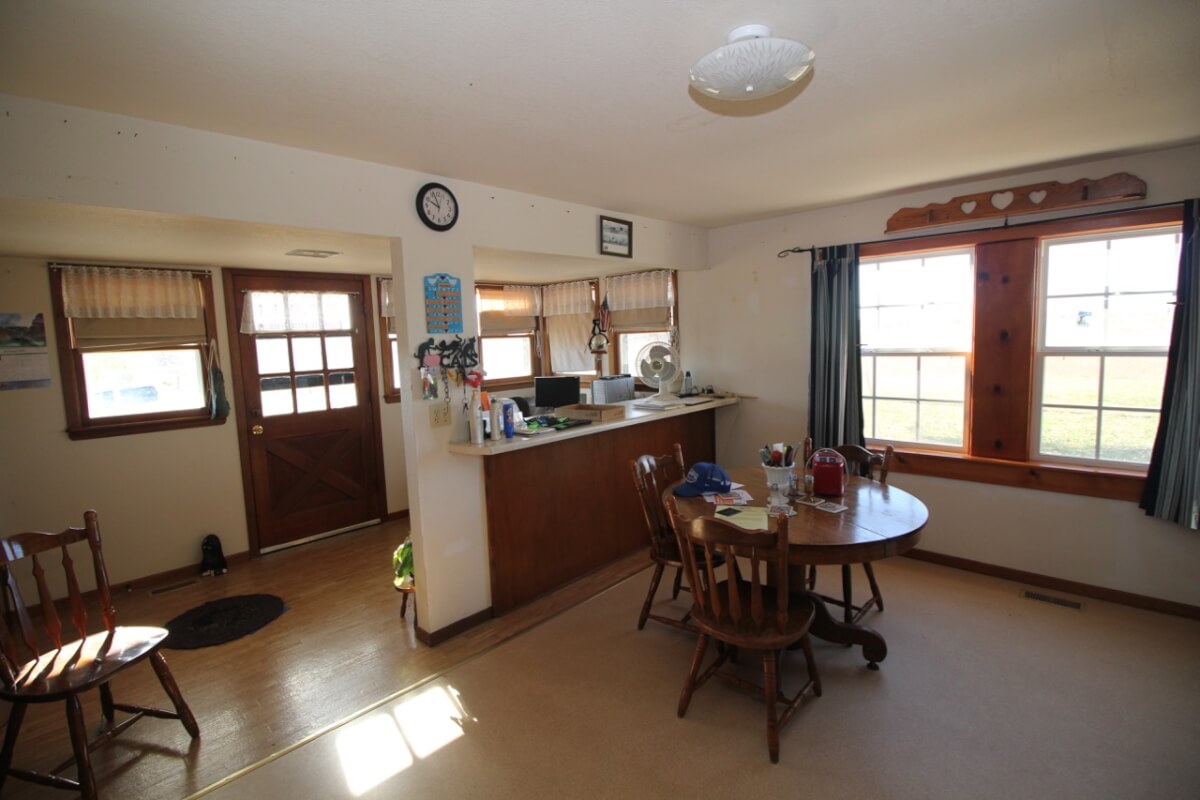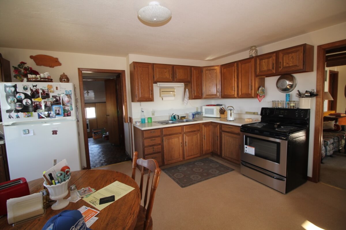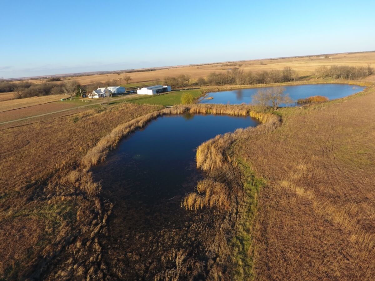 IMPROVEMENTS: A very nicely set up homestead features a 3+ bedroom 1 bath home on rural water and a 50′ x 30′ insulated metal building with concrete floor, electric, and a small office. The house is heated by central HVAC, a wood burning stove, and propane. Other buildings include a 36′ x 60′ hay barn/equipment storage building, 48′ x 16′ lean-to, and several other misc. utility buildings. The long gated driveway allows for a beautiful, secluded, and secure setting. The view of the two stocked clear water fishing ponds from the front porch looking east is fabulous!