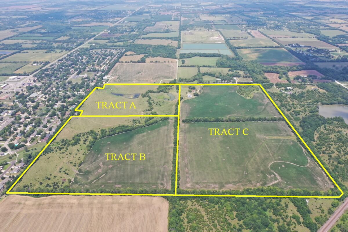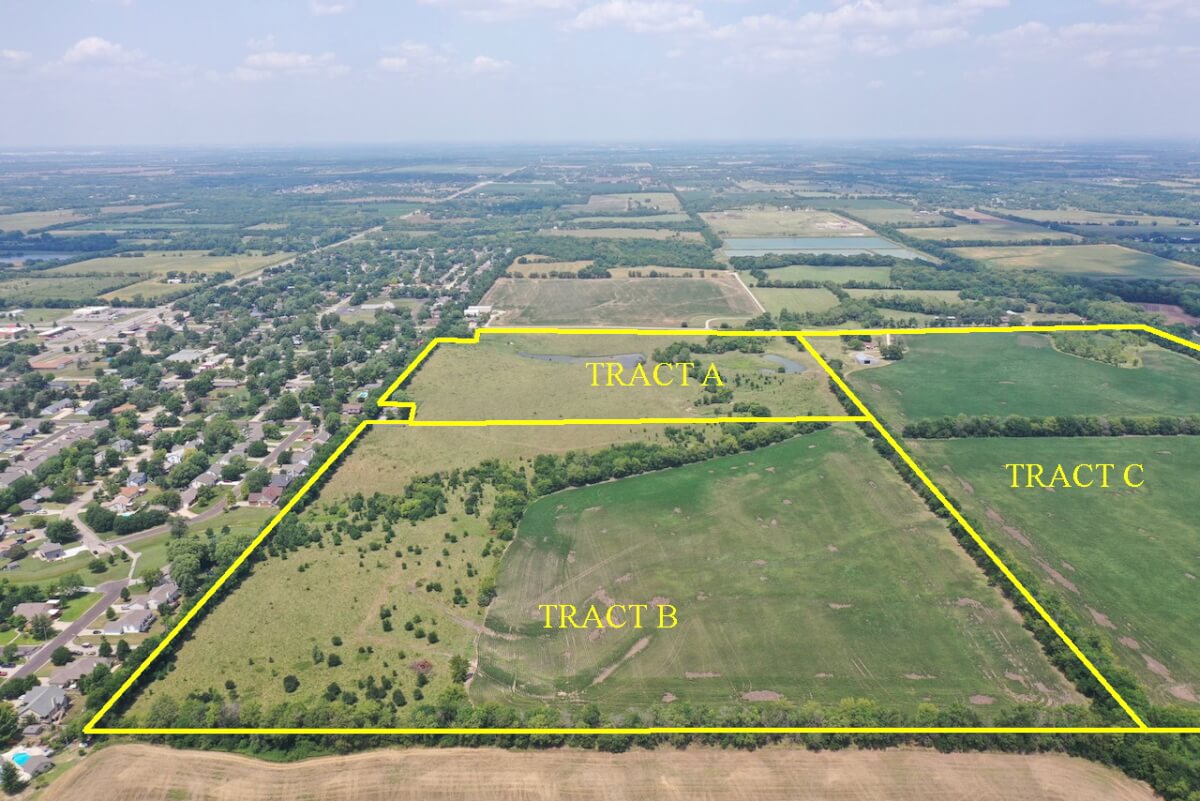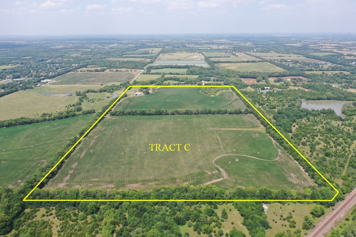 PROPERTY DESCRIPTION: 40.42 acres with an extremely secluded feel, yet with blacktop street access. Tract B is a nice combination of tillable farm ground, pasture, trees, and a wet weather draw. The approximately 20 acres of tillable are currently planted to soybeans, and the current farmer plans to plant wheat following the soybean harvest this Fall. This location is so unique, sitting right on the edge of town with access from a dead end city street allowing you the opportunity to own land without any drive by traffic! The hunting is excellent for Kansas Whitetail Deer, Turkey, and Quail.