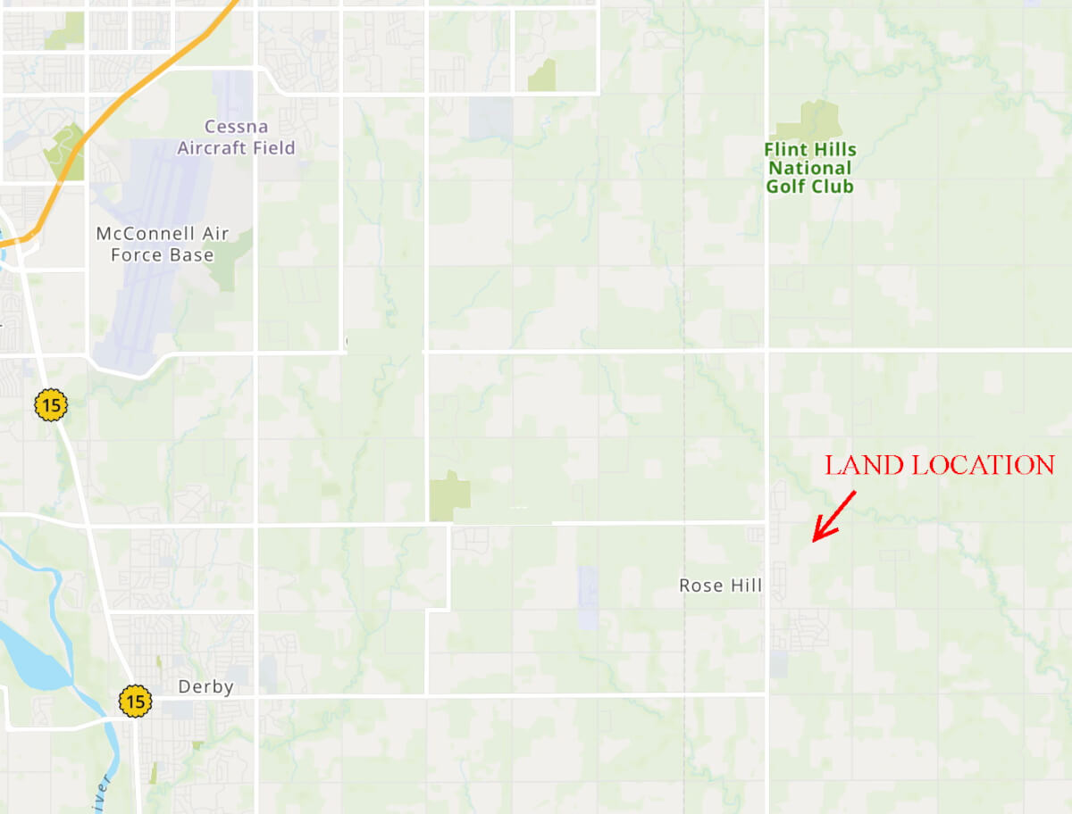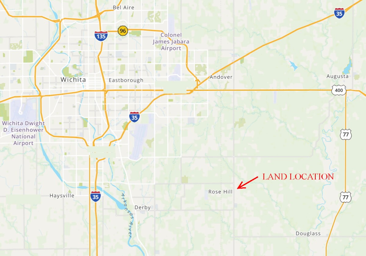 PROPERTY DESCRIPTION: 39.37 acres of premium land located just east of Rose Hill in Butler County, Kansas. This property has blacktop frontage, 2 ponds, a water well, pasture, trees, and public utilities available. Great opportunity to have your own fishing ponds or a place to keep horses and livestock…as well as a tremendous future home building site with two access points, Rosewood St and Waitt St!