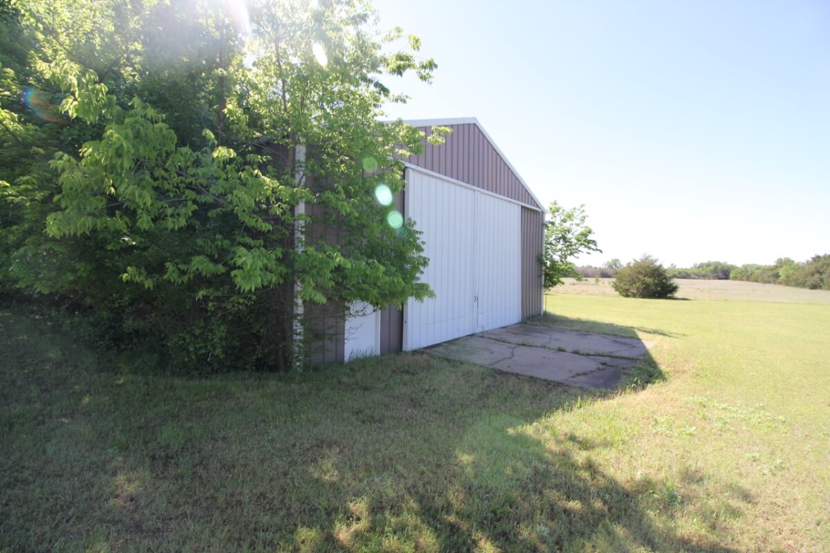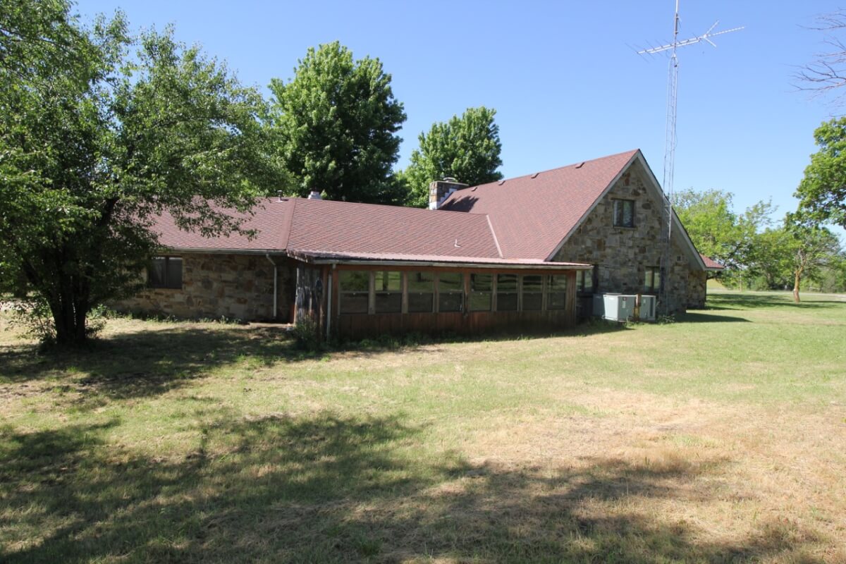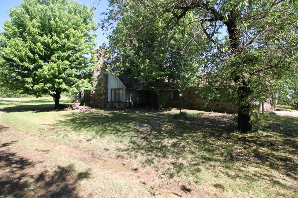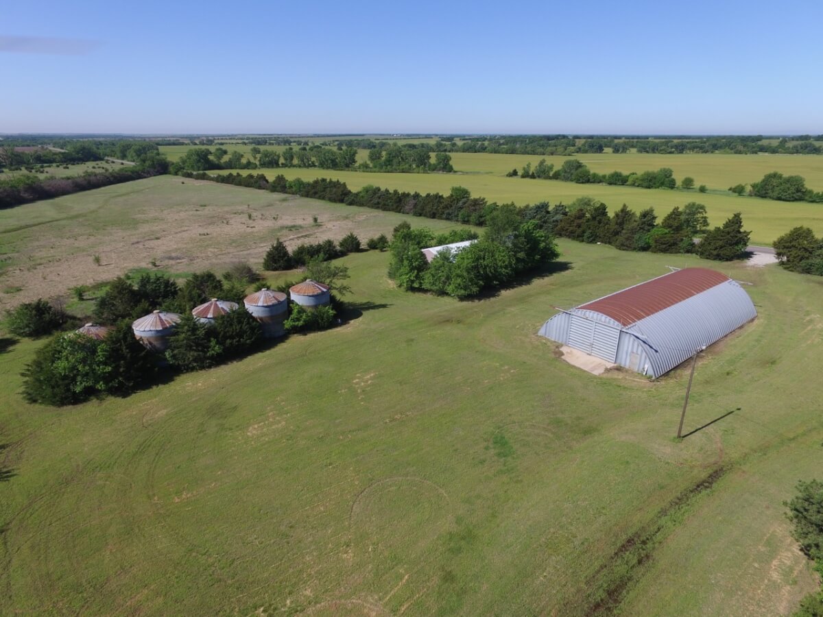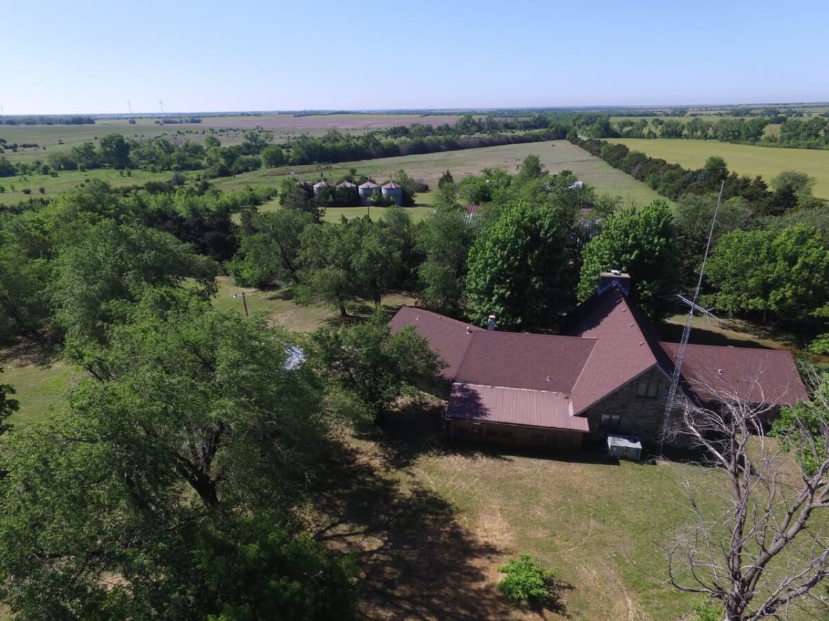 IMPROVEMENTS: This mostly native stone 4 bedroom 2 bath 1 1/2 story home was built in 1977 and has 3348 square feet of above ground finished living area. The 25′ vaulted living room ceiling has beautiful wood beams and a native stone fireplace that is sure to impress! The kitchen includes a butcher block island and plenty of cabinet space. Water is supplied to the house by rural water district #4. A new 50 year shingle roof is only a few years old. Buildings on the property include a 100′ x 50′ quonset building with concrete floor, 80′ x 40′ metal building with concrete floor, and several miscellaneous utility buildings, tool sheds, and steel grain bins.