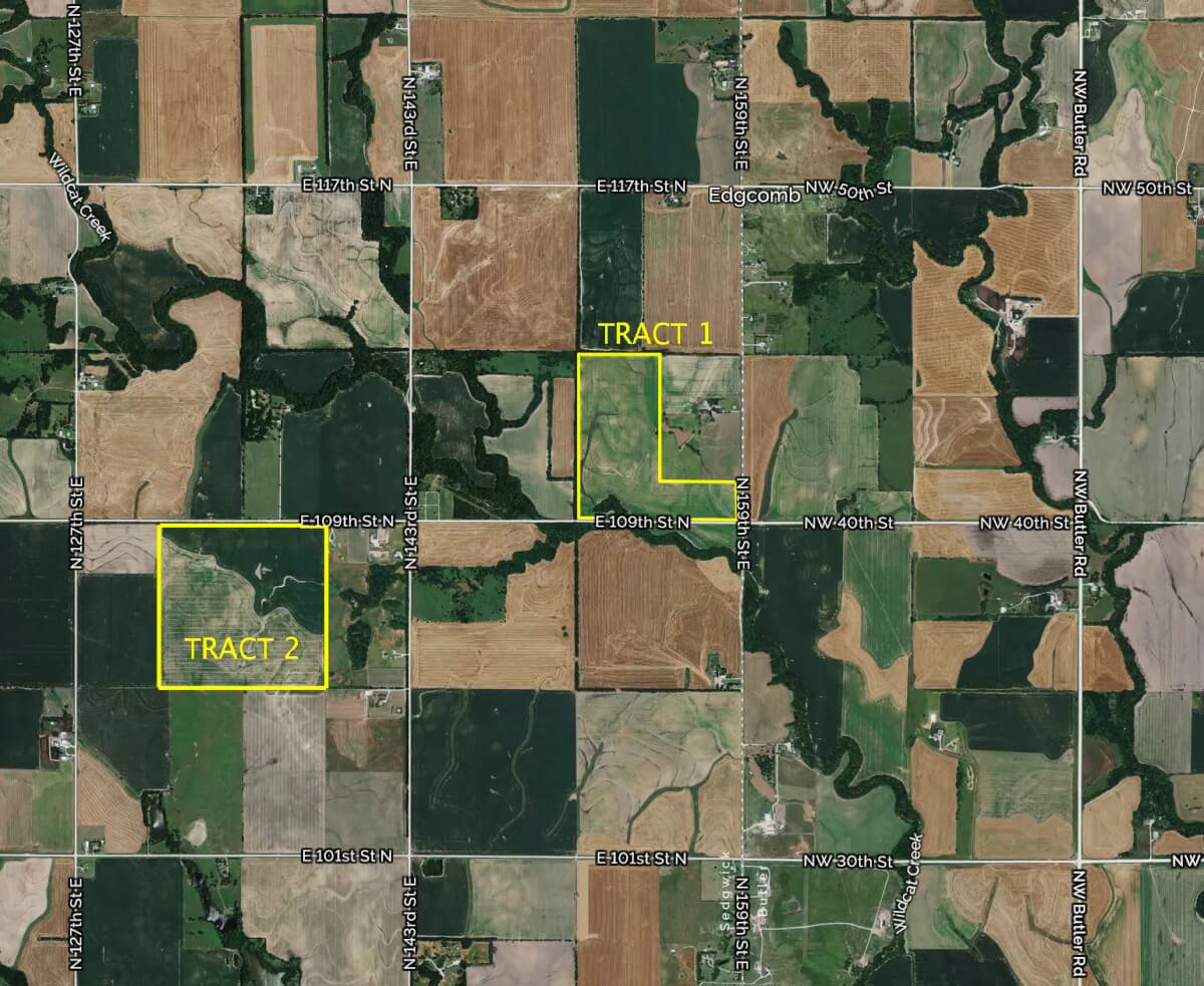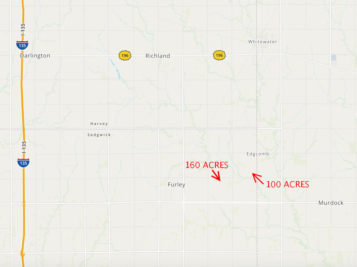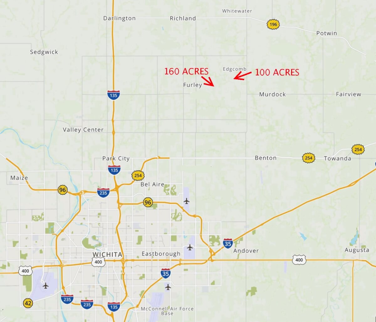 LAND LOCATION: From I-135 North of Wichita, East 7 1/2 miles on 101ST St N to 127TH ST E, North 1 mile to 109th St N, East 1/4 mile to the property OR 1 1/4 Mile East of Furley on 109th St N.