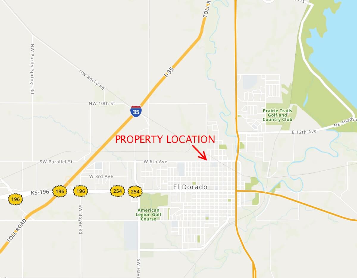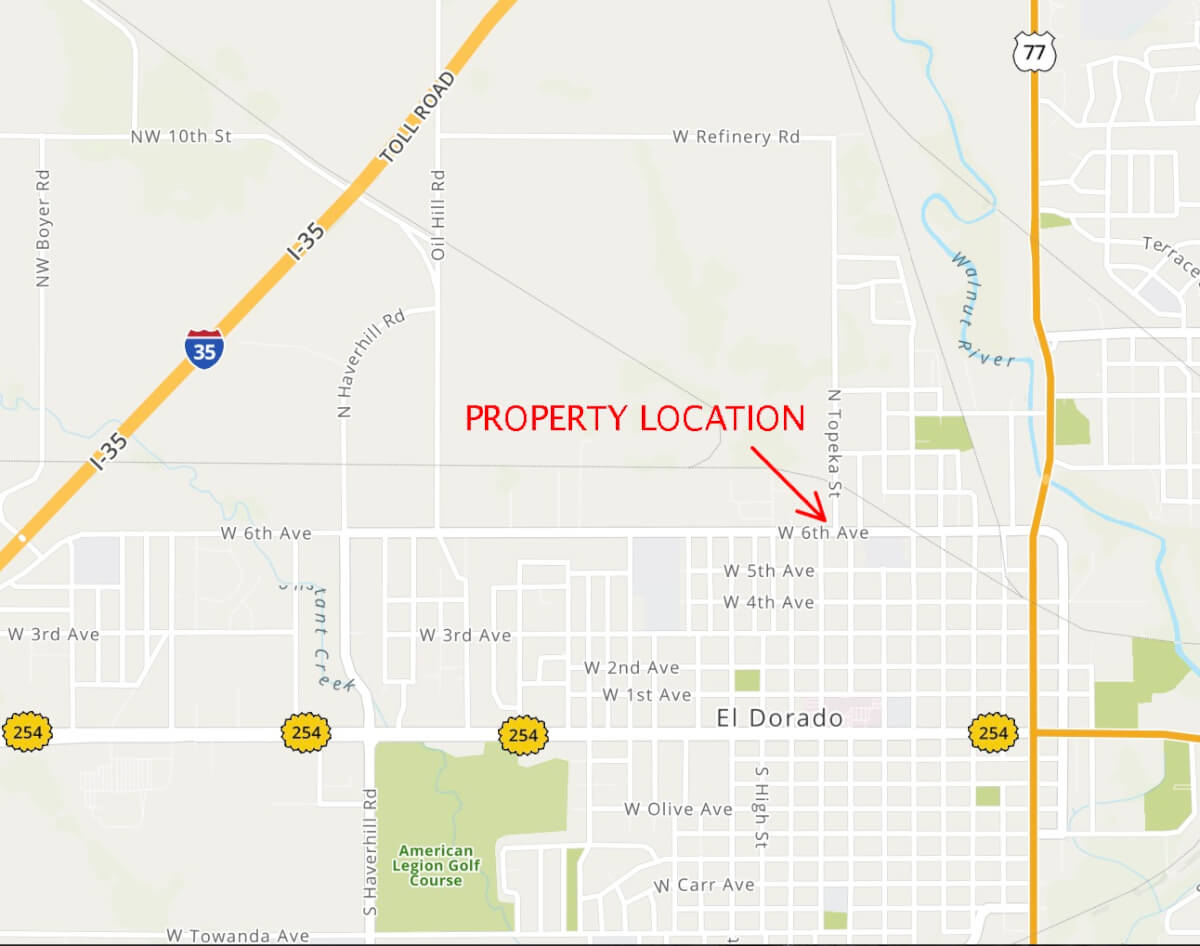 PROPERTY DESCRIPTION: 160′ X 140′ lot located on 6th Ave, which is the Northwest Trafficway in El Dorado, Kansas. Great opportunity to invest in a high traffic count location on a corner lot. Favorable R-3 zoning offers a wide array of development potential. This site formerly had a residential structure and garage that have both been removed, so the 2021 real estate taxes will be much lower with the vacant lot status. Great opportunity to look at possible future multi family or commercial use. Invest in Location, Invest in El Dorado!