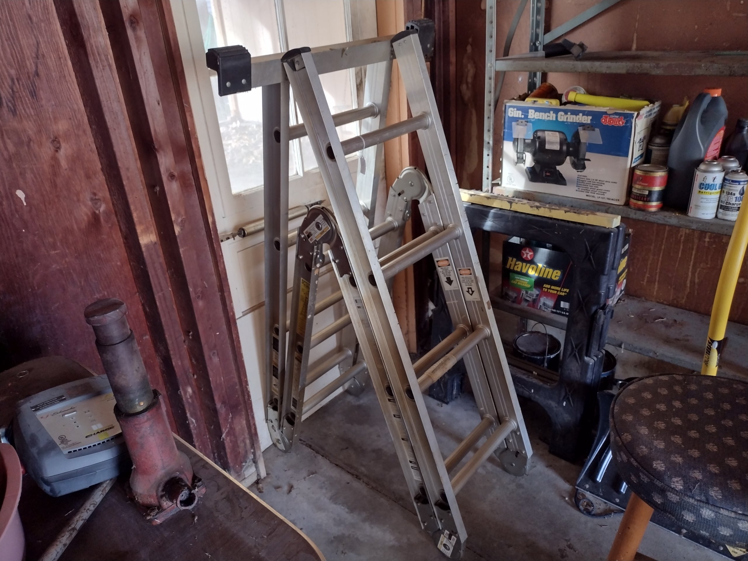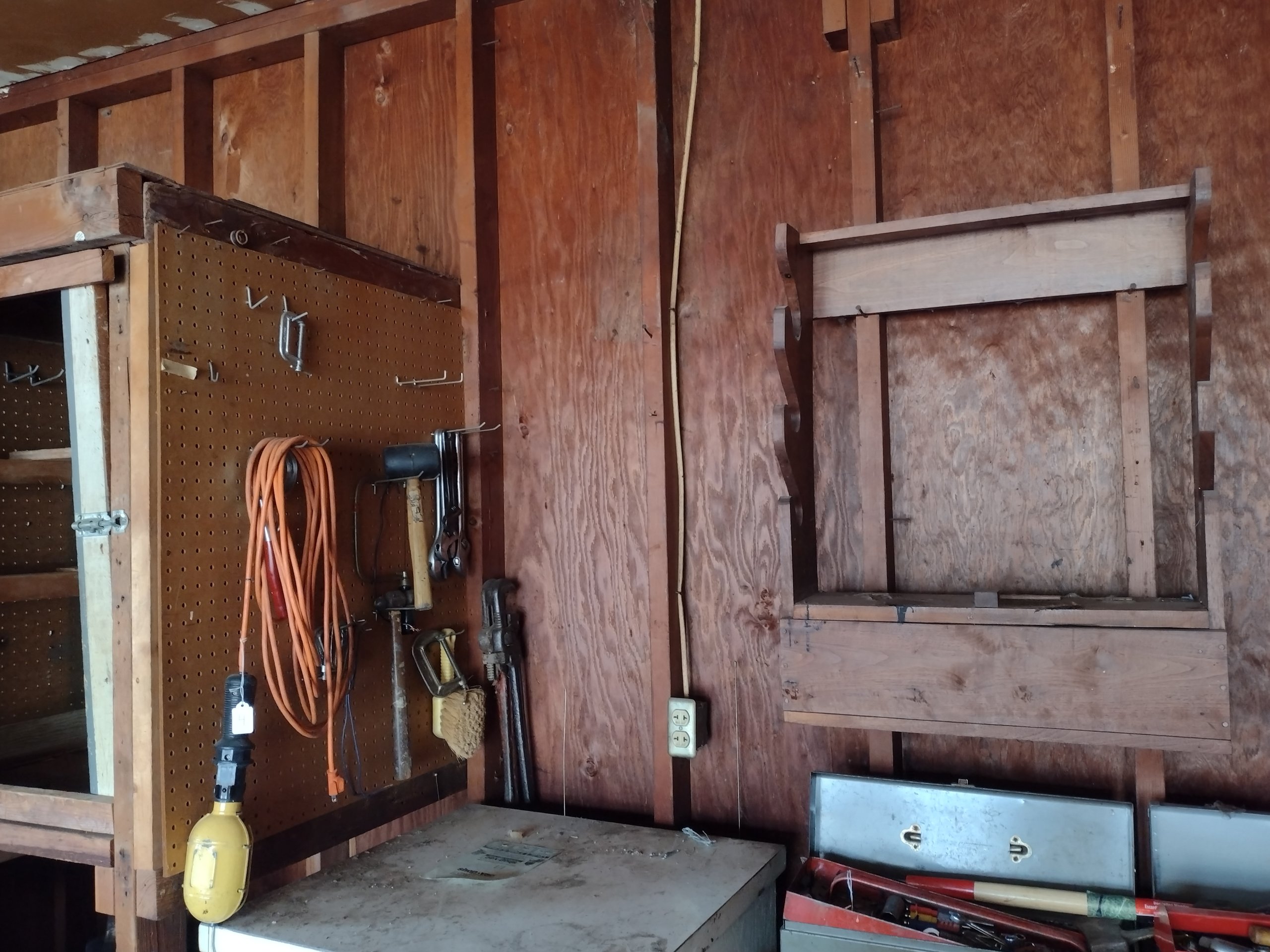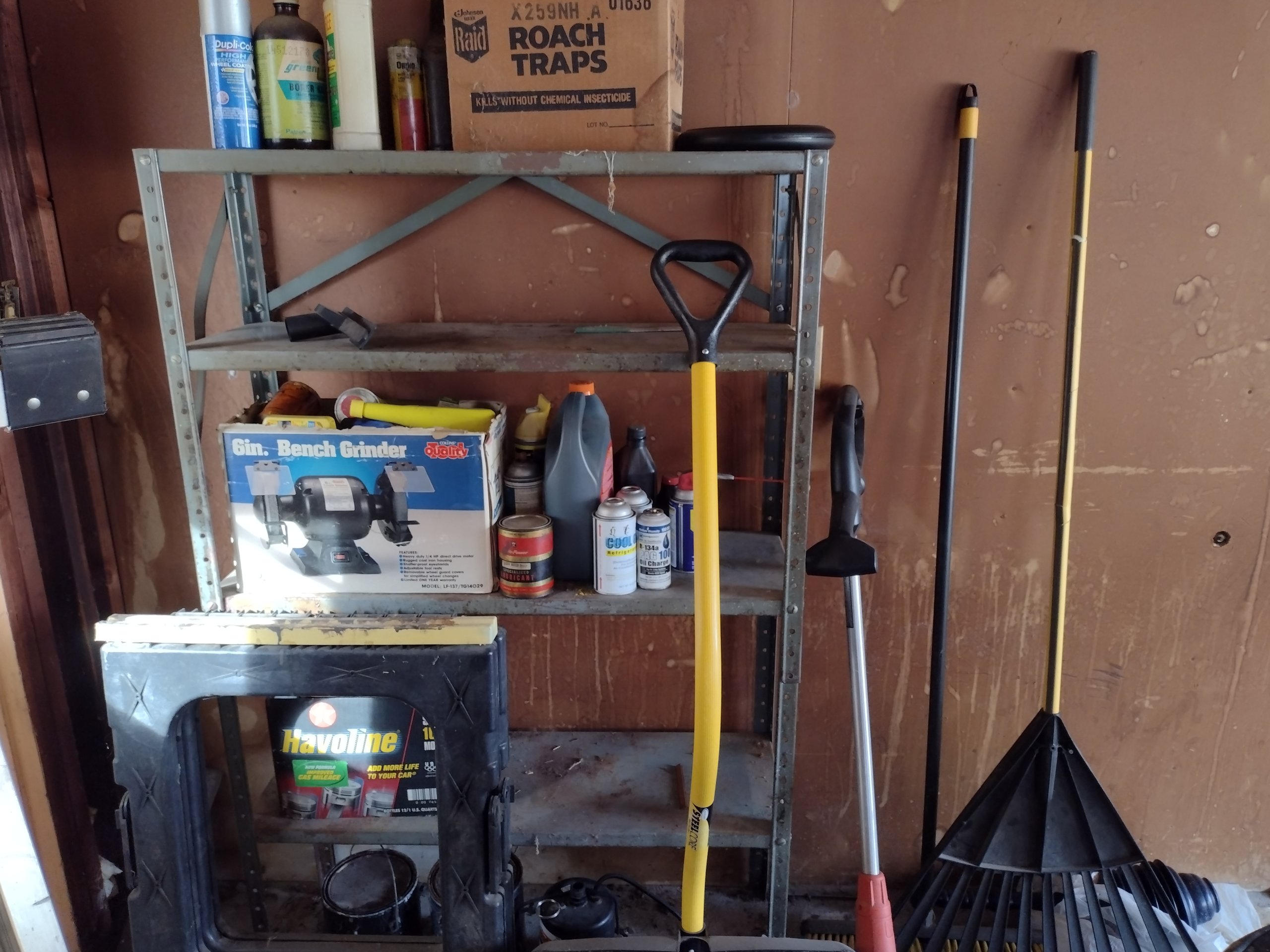 9 Metal Shelf, Sawhorses, Lubricants, Pump, Electric Weedeater, Yard Tools, Snow Shovel