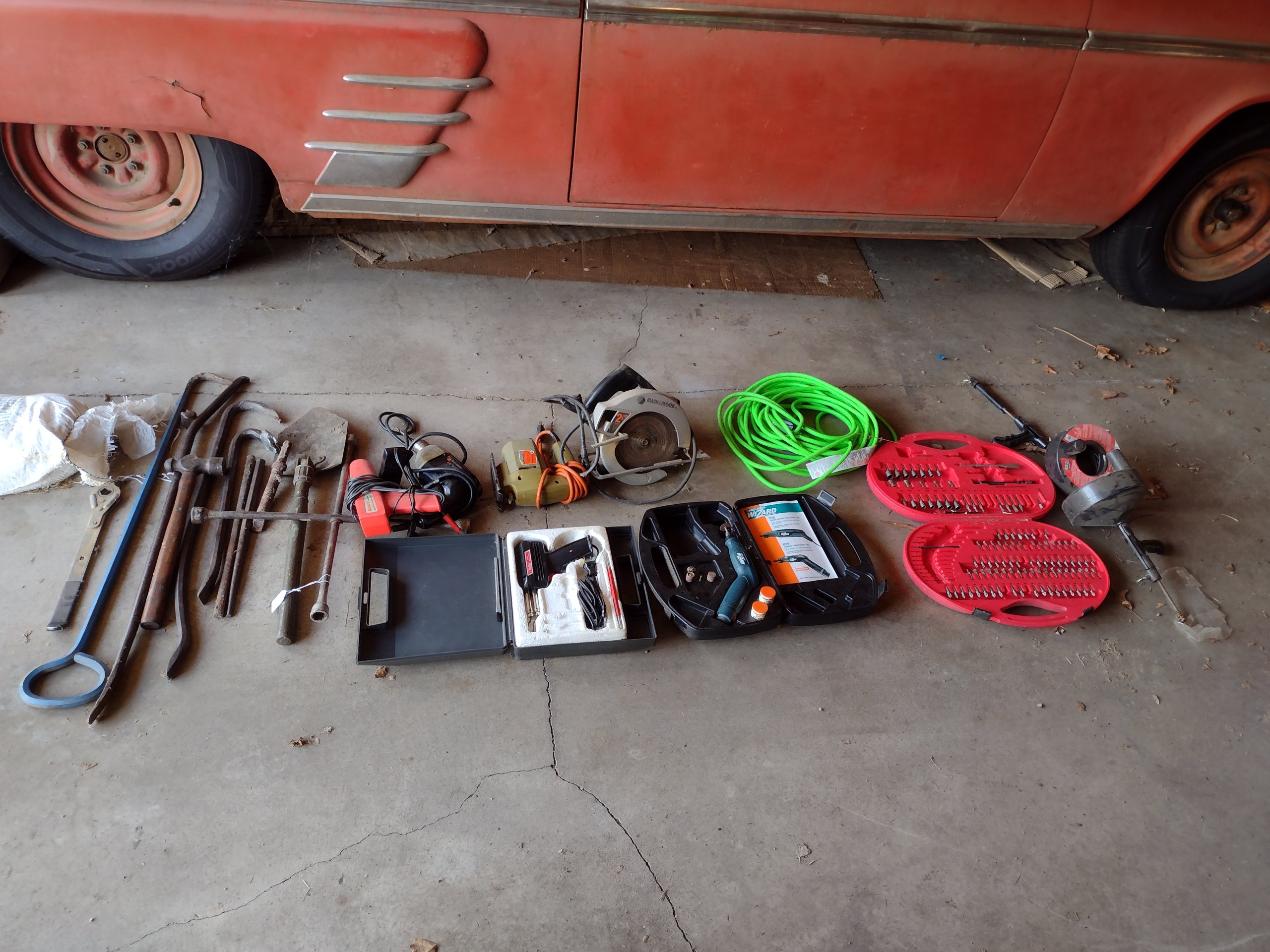 17 Tool Lot: Sewer Snakes, Pry Bars, Corded Tools, Extension Cord, Bits