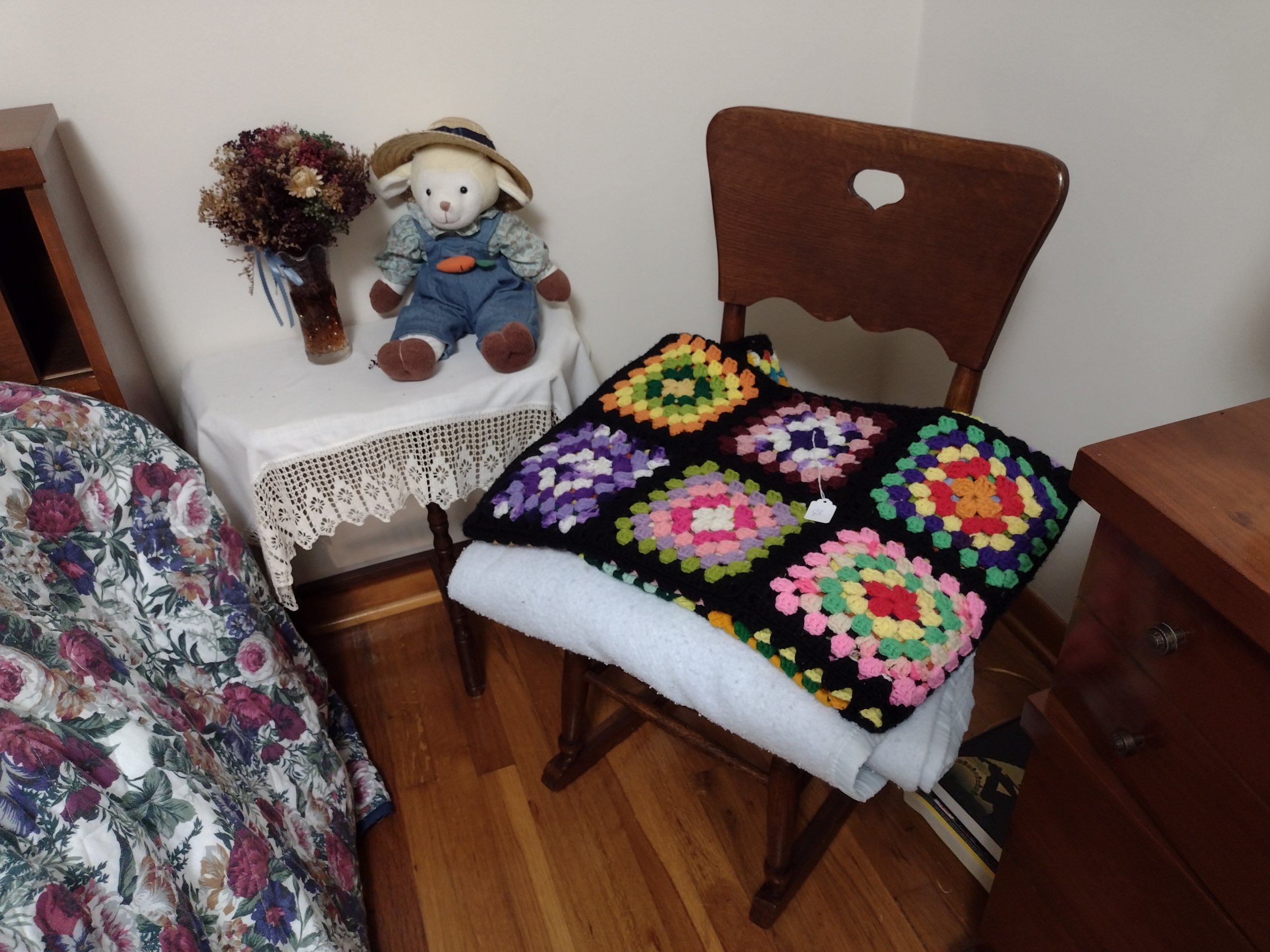 88 Wooden Rocker, Blankets, End Table