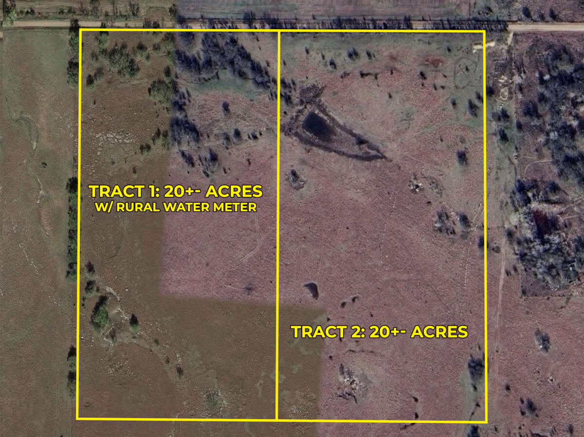 TRACT 1 PROPERTY DESCRIPTION: The west 20 offers great variety: small pond, pasture, timber, and rural water meter in place. Access is off SE 20th, and 1.5 miles from 2 paved roads. Utilities are available. Great opportunity for a building site OR keep a few livestock!