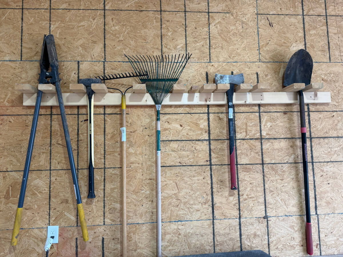 96 Axe, Rakes, Shovel, Sledge Hammer & Grabbers