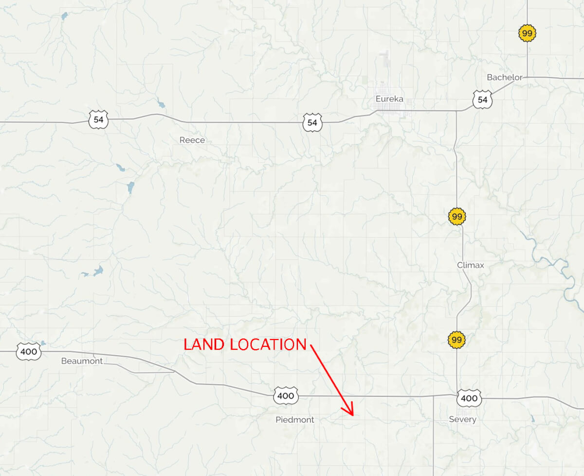 LAND LOCATION: From HWY 400 between Piedmont & Severy, South 1 Mile on M Rd to 10th, East 1/4 Mile to the Property (there is also frontage on M Rd).