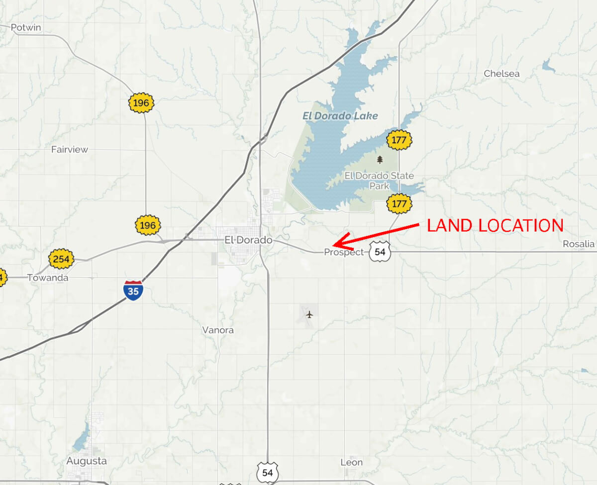 LAND LOCATION: From El Dorado, 3 miles East on HWY 54 to Bluestem Rd, 1 Mile North to Parallel, 1/2 Mile West to the property.