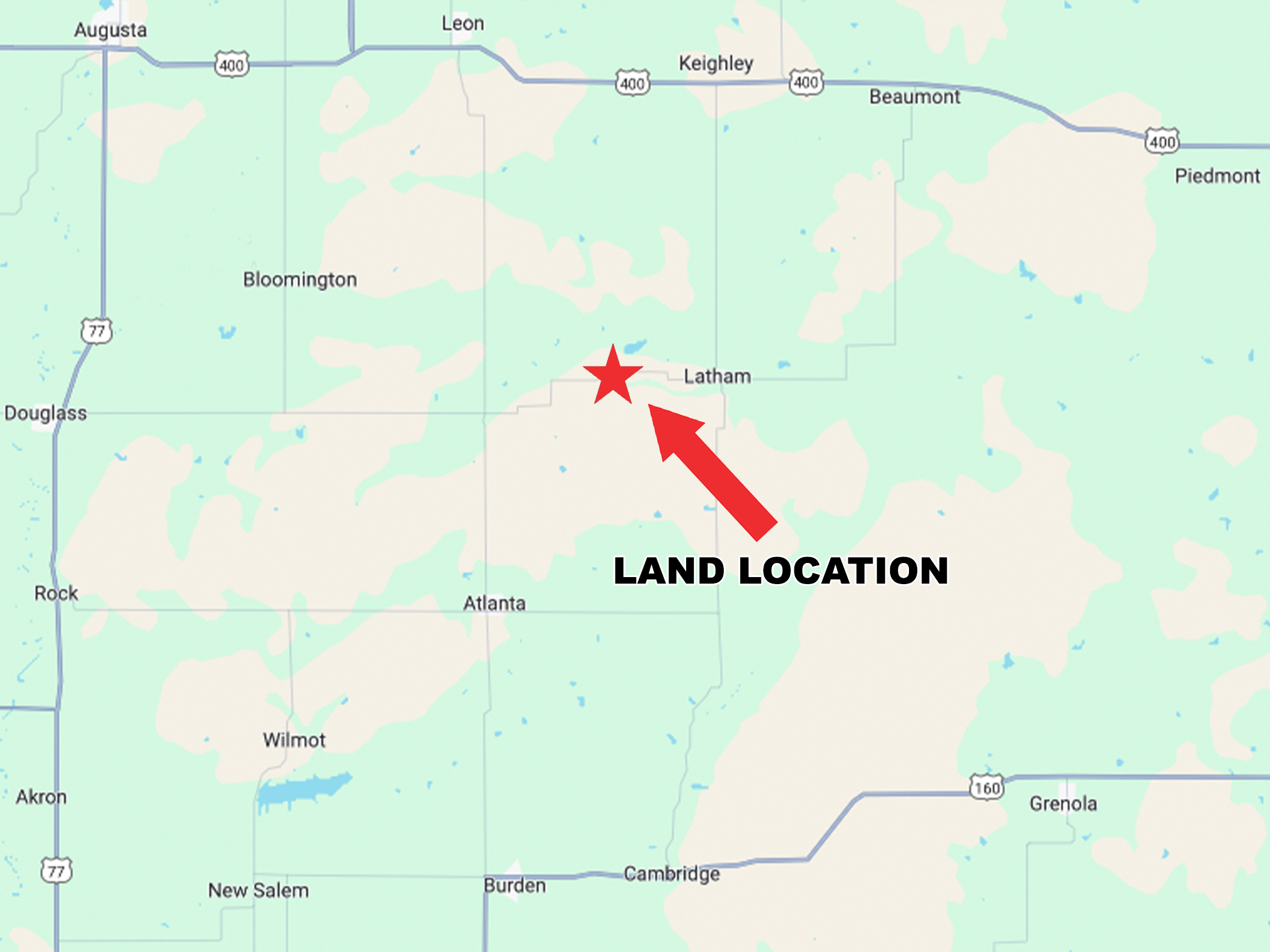 LAND LOCATION FROM LATHAM: 3 3/4 miles west on 200th.