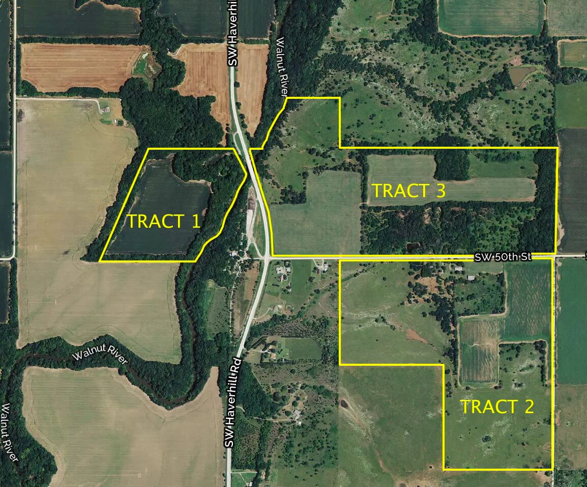 TRACT 1 PROPERTY DESCRIPTION: 38.8 acres of Walnut River tillable bottom ground, timber, and the Walnut River. Truly a unique opportunity to purchase the highest of quality land in an affordable size. Located just off blacktop Haverhill Rd, this property offers hunting, fishing, recreation, and enjoyment with agriculture income.