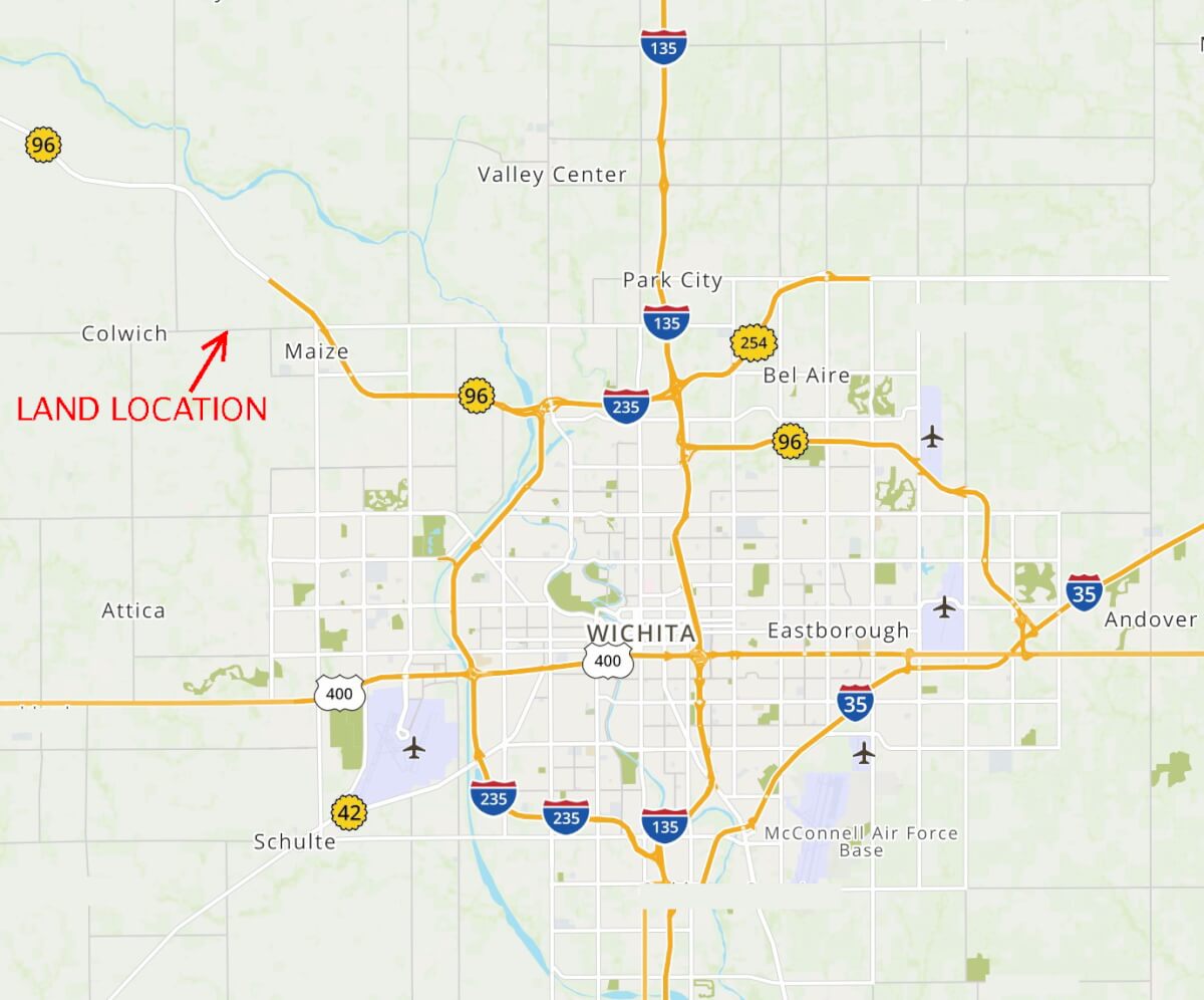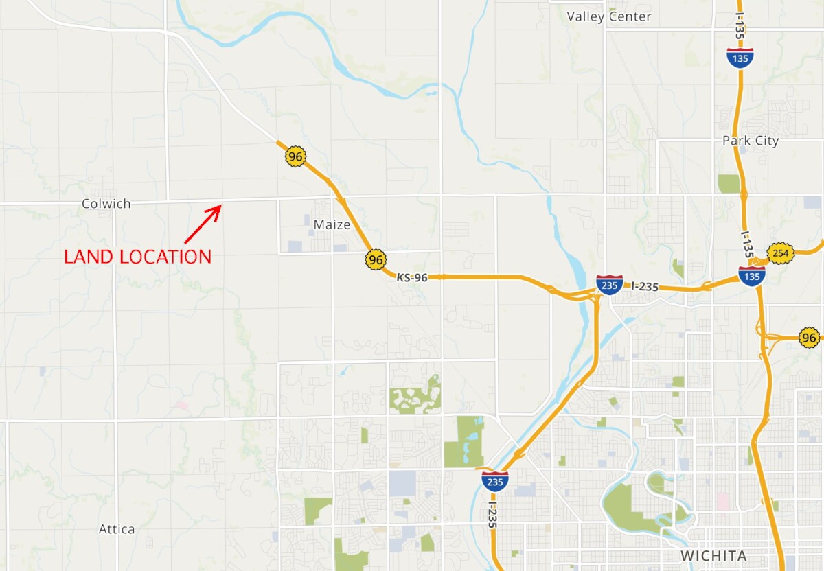 PROPERTY DESCRIPTION: 28.4 acres of Sedgwick County, Kansas land located between Maize and Colwich. Great location, in the path of Northwest Wichita Metro development. Blacktop on two sides, 53rd Street North and 135th Street West. Currently zoned agriculture. Great opportunity to own land with low holding costs, agriculture income, and future development potential!