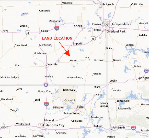 LAND LOCATION:  From Eureka, Kansas 10 miles north on P Rd. (State St.), 1 mile west on 255th St., 1 1/2 mile north on N Rd., then west on 270th.