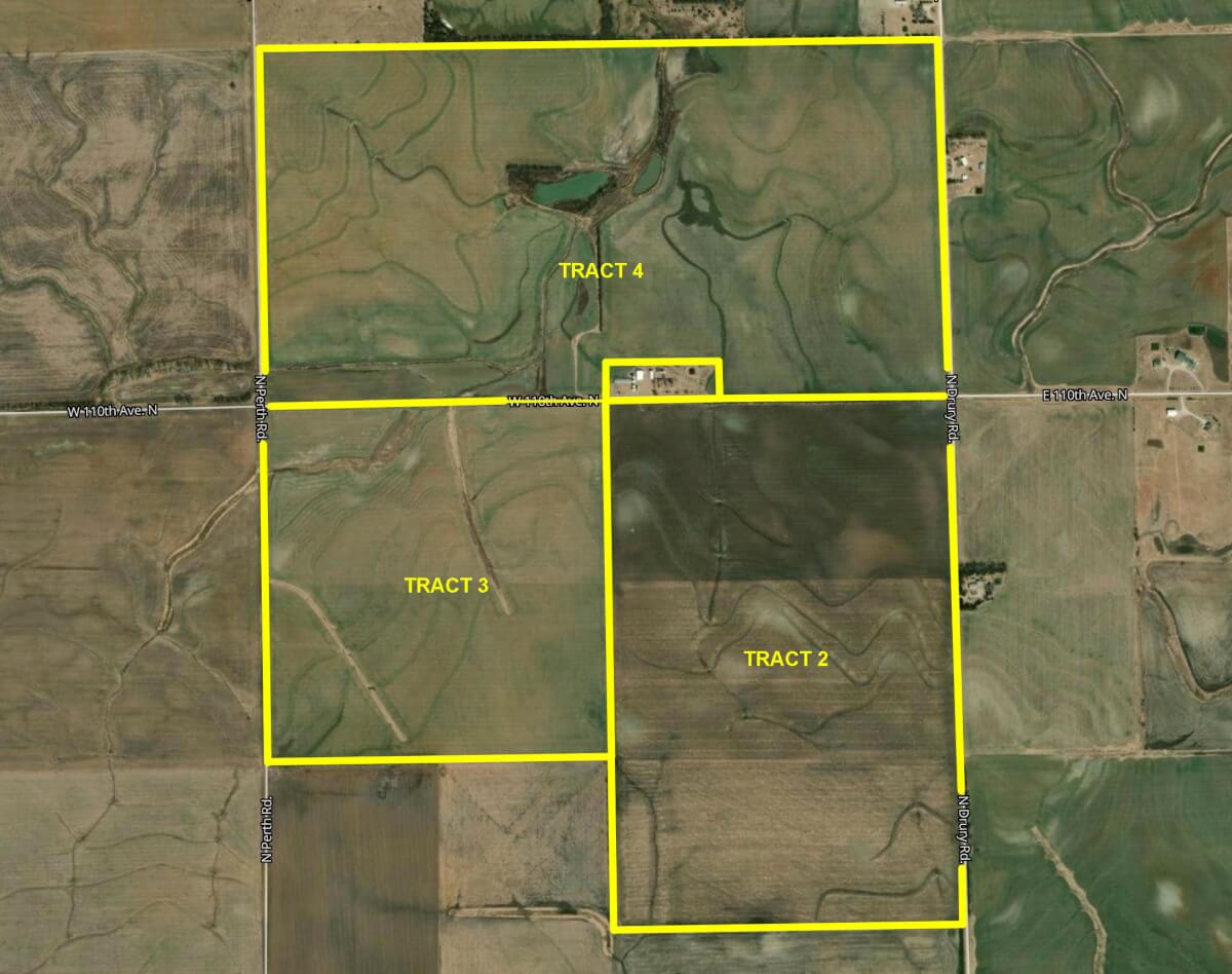 TRACT 4 PROPERTY DESCRIPTION: 299.7 acres south of Clearwater in Sumner County, Kansas. Access is provided by Perth Rd along the west, 110th Ave along the south, and Drury Rd along the east. While a majority of the property is wheat, there are two nice ponds and some tree rows located near the center of the property offering some hunting/fishing/recreation value. Possession of the property will be at closing subject to the growing wheat harvest. The buyer shall receive the landowners share of the growing wheat crop and be responsible for 1/3 of the fertilizer and chemical expenses. Another great opportunity to Invest In Land!