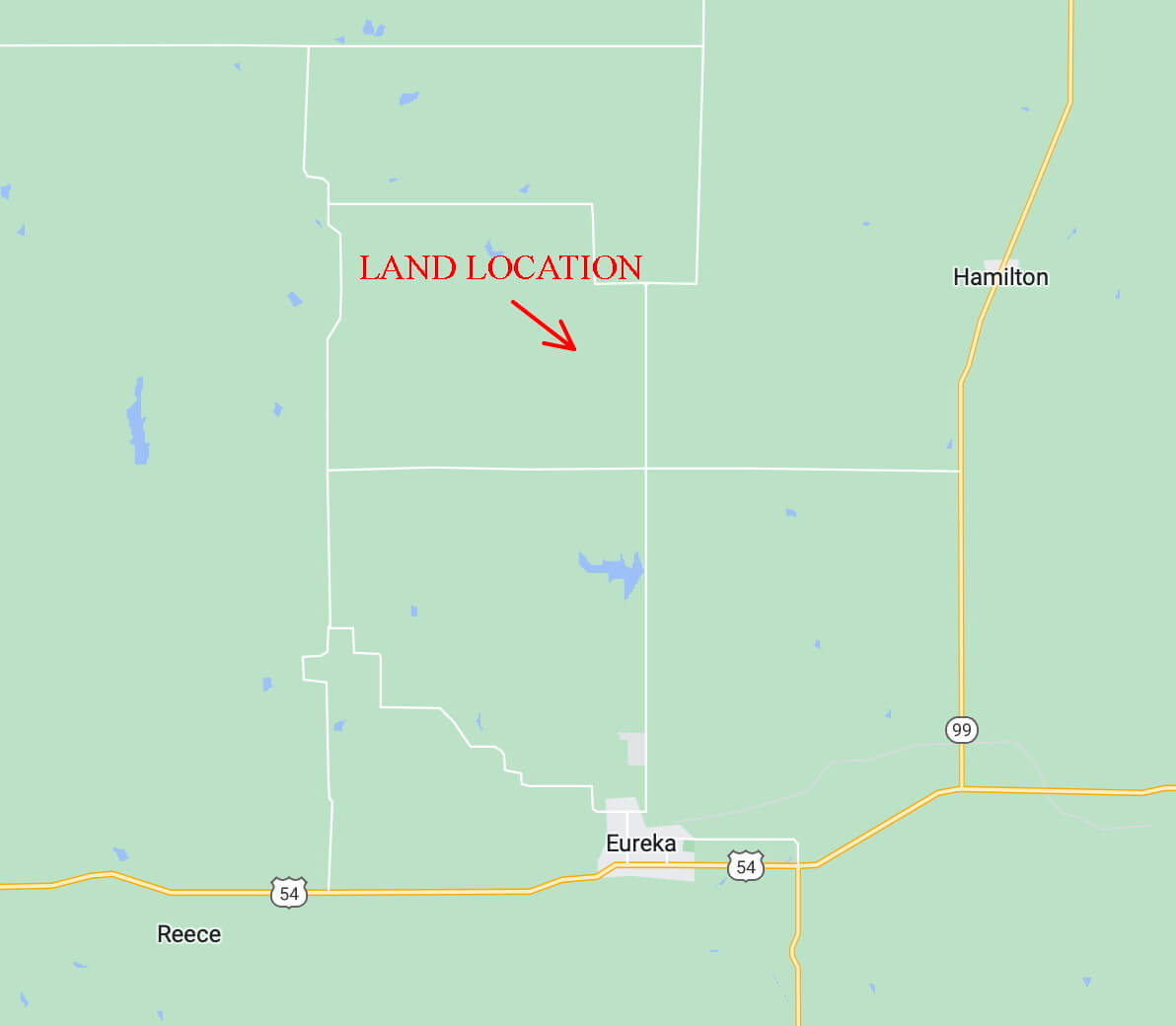 LAND LOCATION: From Eureka, north on P Rd 6 1/2 miles to 220th St, west 1 mile to N Rd, north 2 miles to the property.