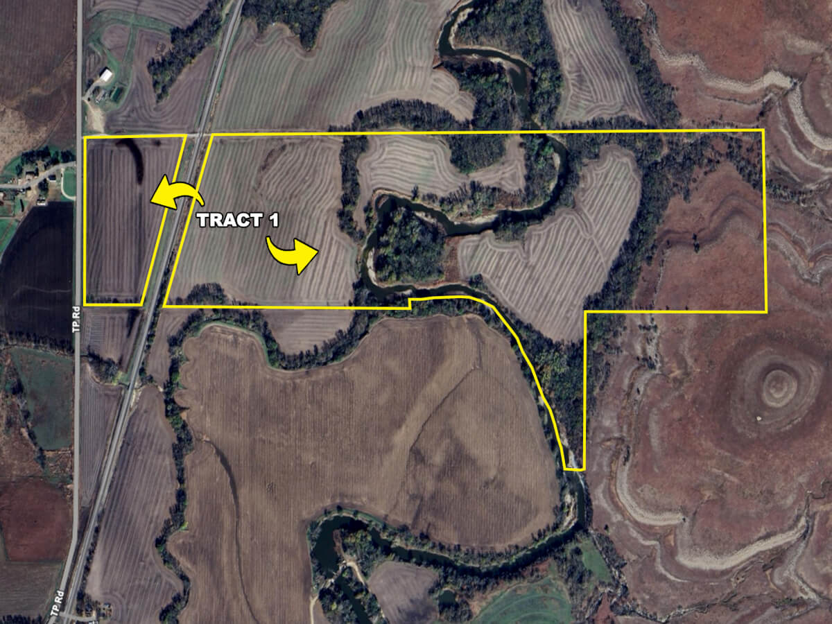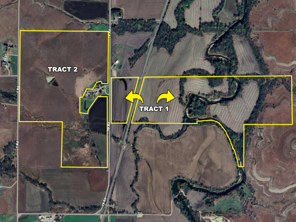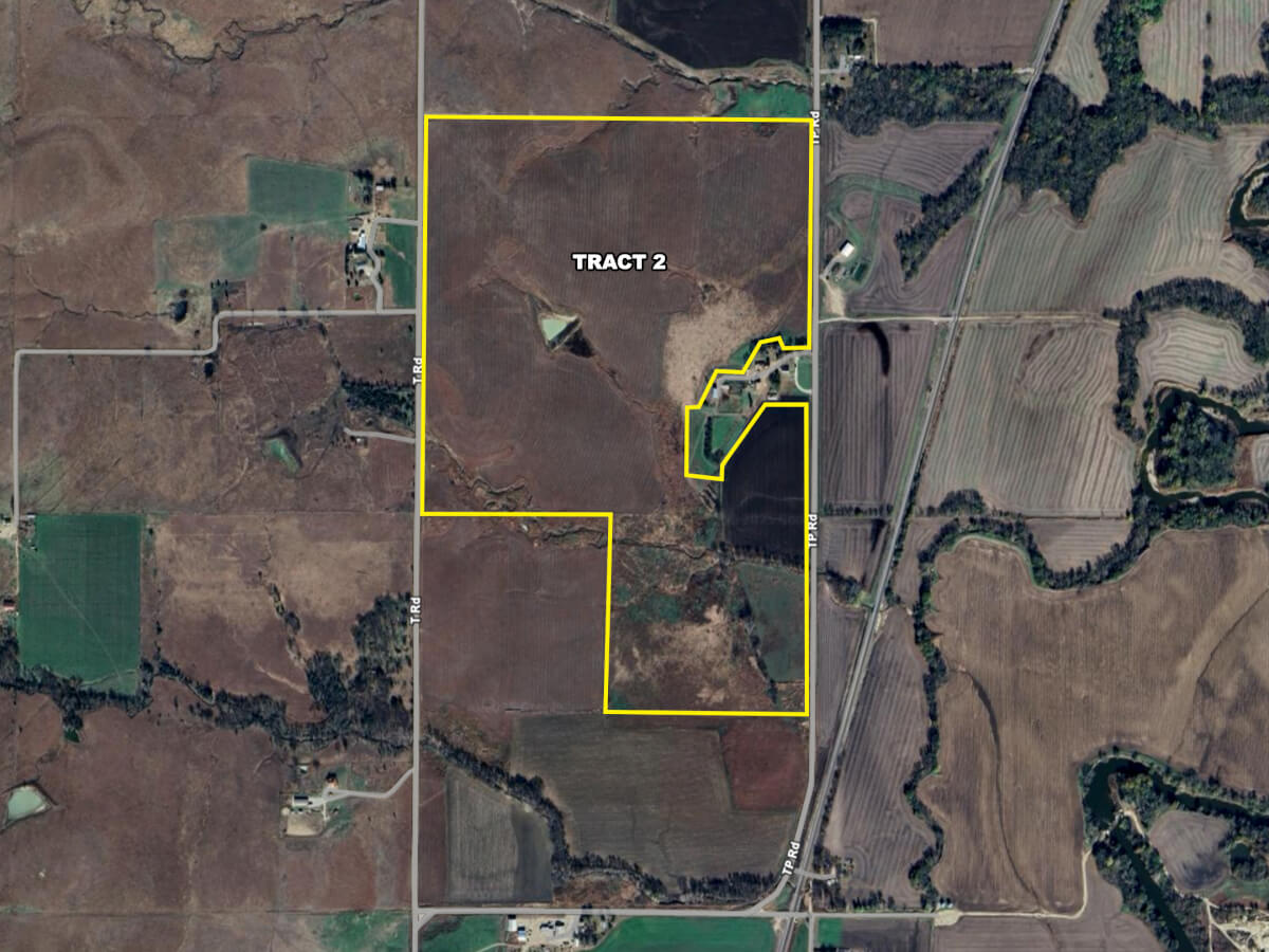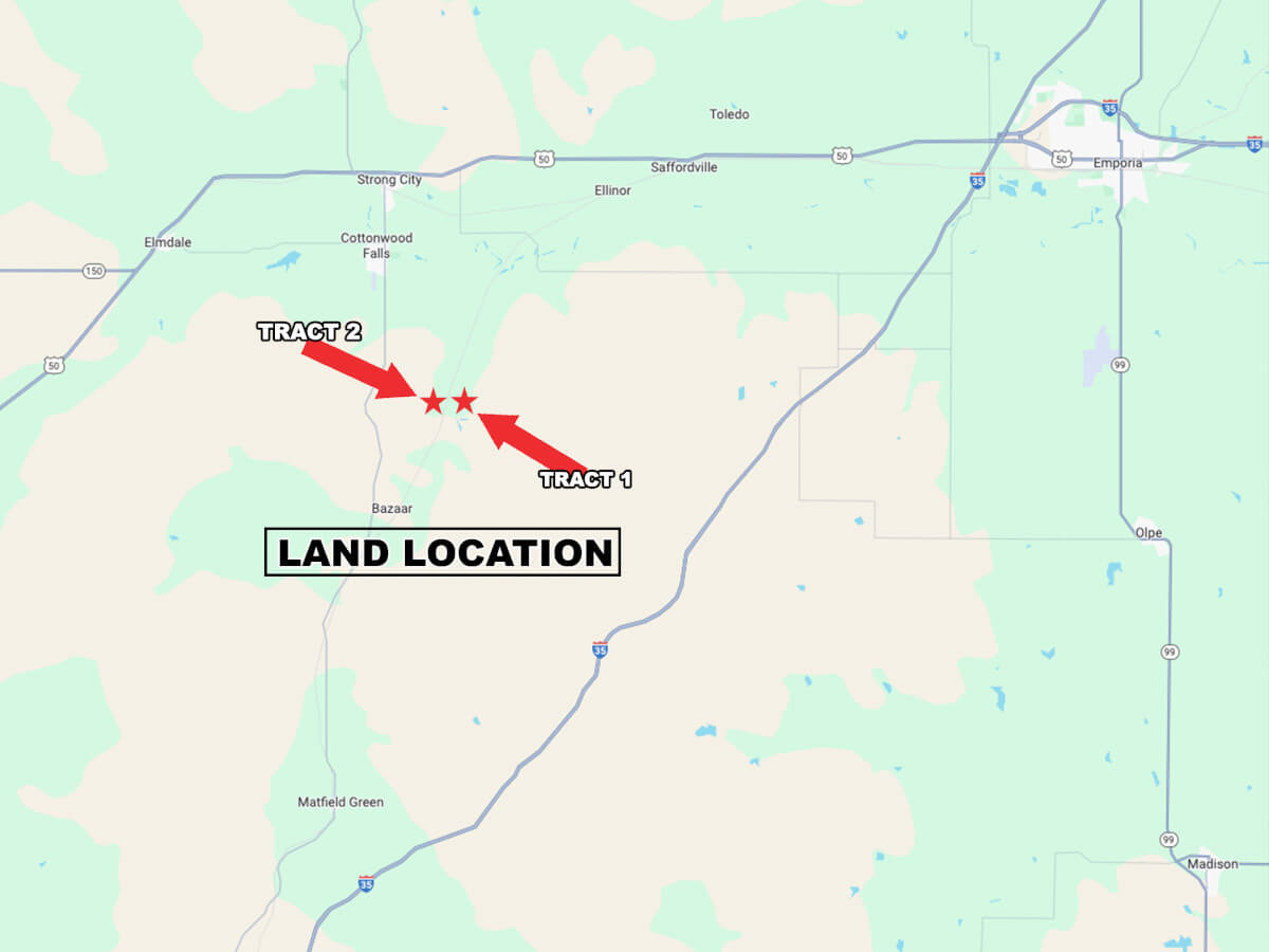 LAND LOCATION FROM COTTONWOOD FALLS: From Casey’s, east on 210 Rd 1 mile to T Rd, south 2 1/4 miles to 180 Rd, east 1/4 mile to TP Rd, south 1 1/4 mile to the property.