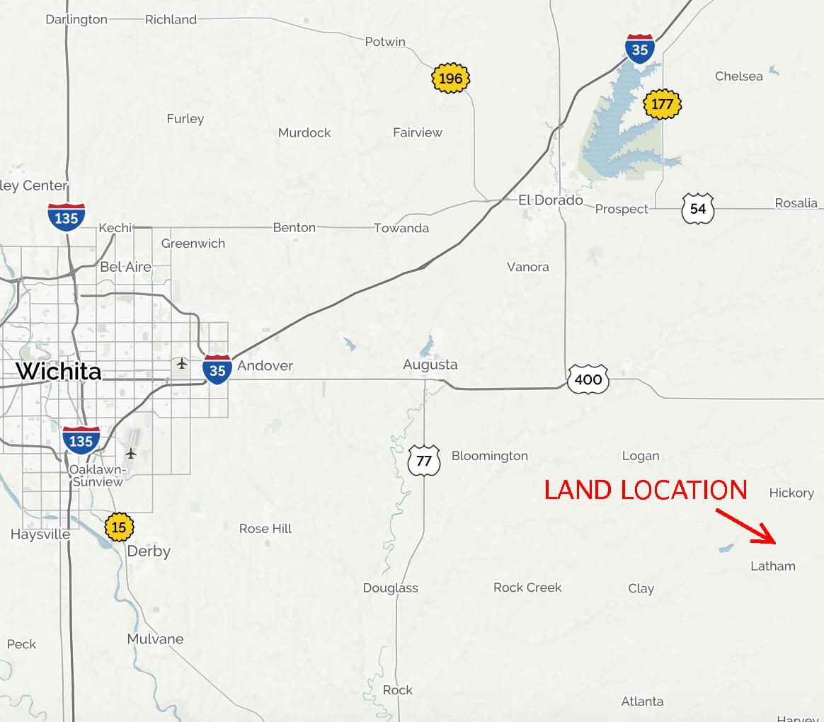 LAND LOCATION: From Latham, Kansas 2 Miles North on Stoney Creek Rd to 180th, 1 Mile East to the property.