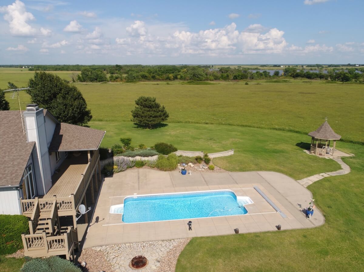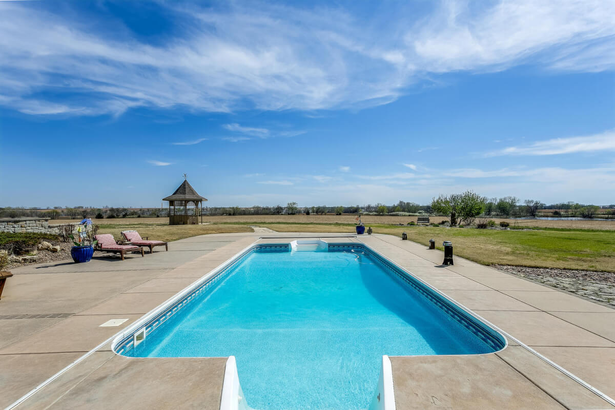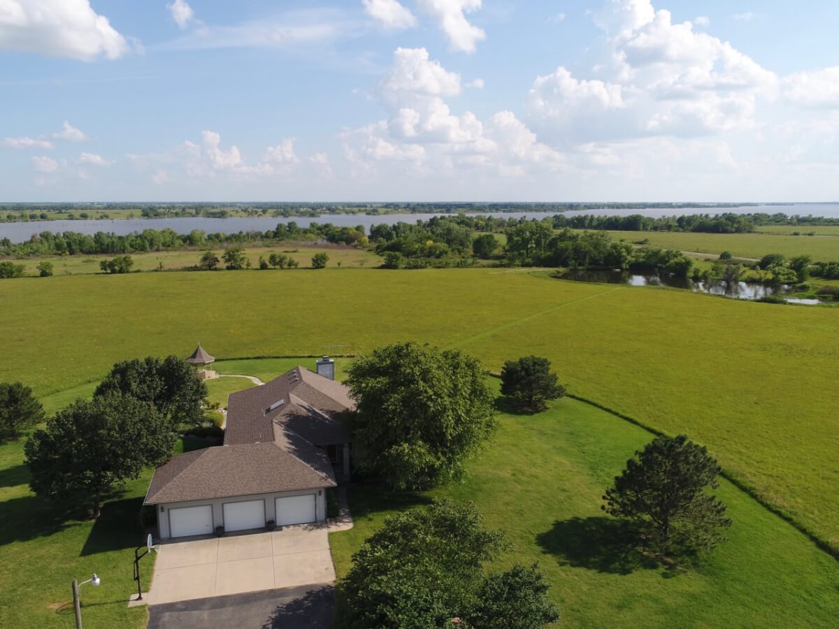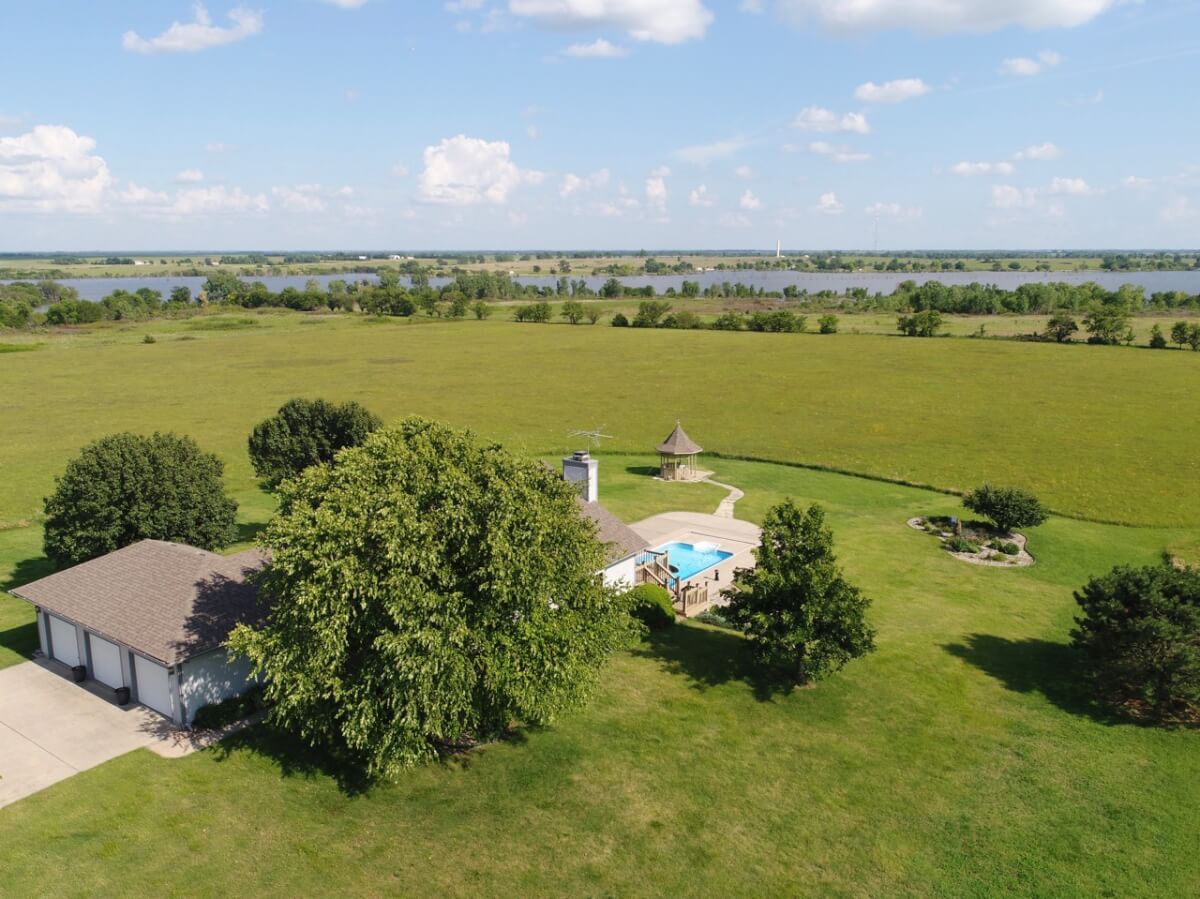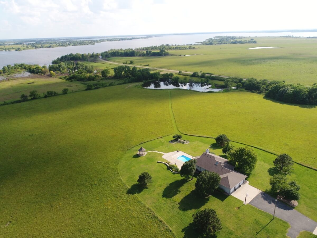 PROPERTY DESCRIPTION: Wildlife, fishing, hunting, boating, and outdoor recreational lodge-like get-away close to Wichita! Truly one of a kind 33+- acre property in which El Dorado Lake can be viewed from nearly every window of the house. Just think of the entertainment value of the back pool/patio area. The main level of the home offers a semi-open floor plan, master suite with jacuzzi tub, guest bedroom, full bath, and laundry/mud room with wash sink. The walk-out basement offers a huge rec/family room with great wet bar area, full bath, 2 bedrooms, and an additional bonus room. A 30’x24′ heated shop with pull through overhead doors offers great additional work room. The balance of the property consists primarily of hay meadow and don’t forget about the pond! Abundant wildlife frequent this property including deer, turkey, and quail. Now is the time to buy your slice of paradise.