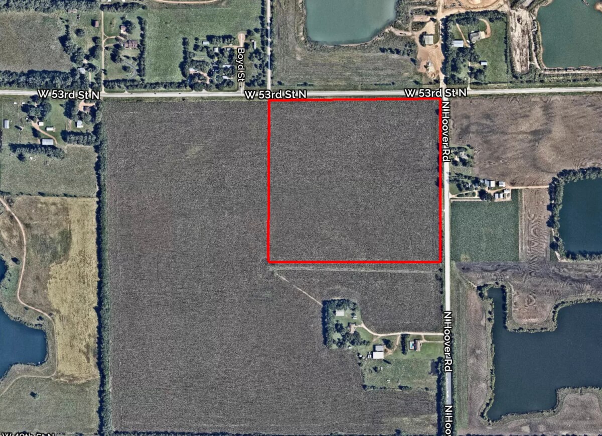PROPERTY DESCRIPTION: 40+- acres of excellent quality tillable farm ground currently planted to Wheat. Excellent location at the corner of Hoover Rd and 53rd St N. Great opportunity to purchase productive income producing tillable farm ground with future commercial development potential. Several of the neighboring properties have been utilized for harvesting sand and converted to sand pit lakes, which are desirable for residential and commercial development. Invest in Agriculture and future Development land!