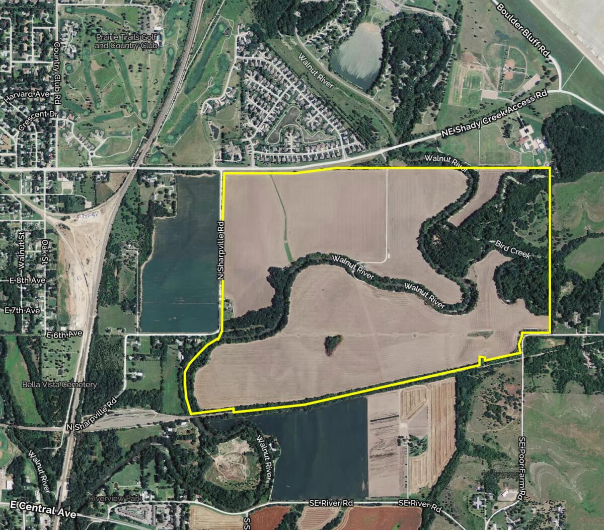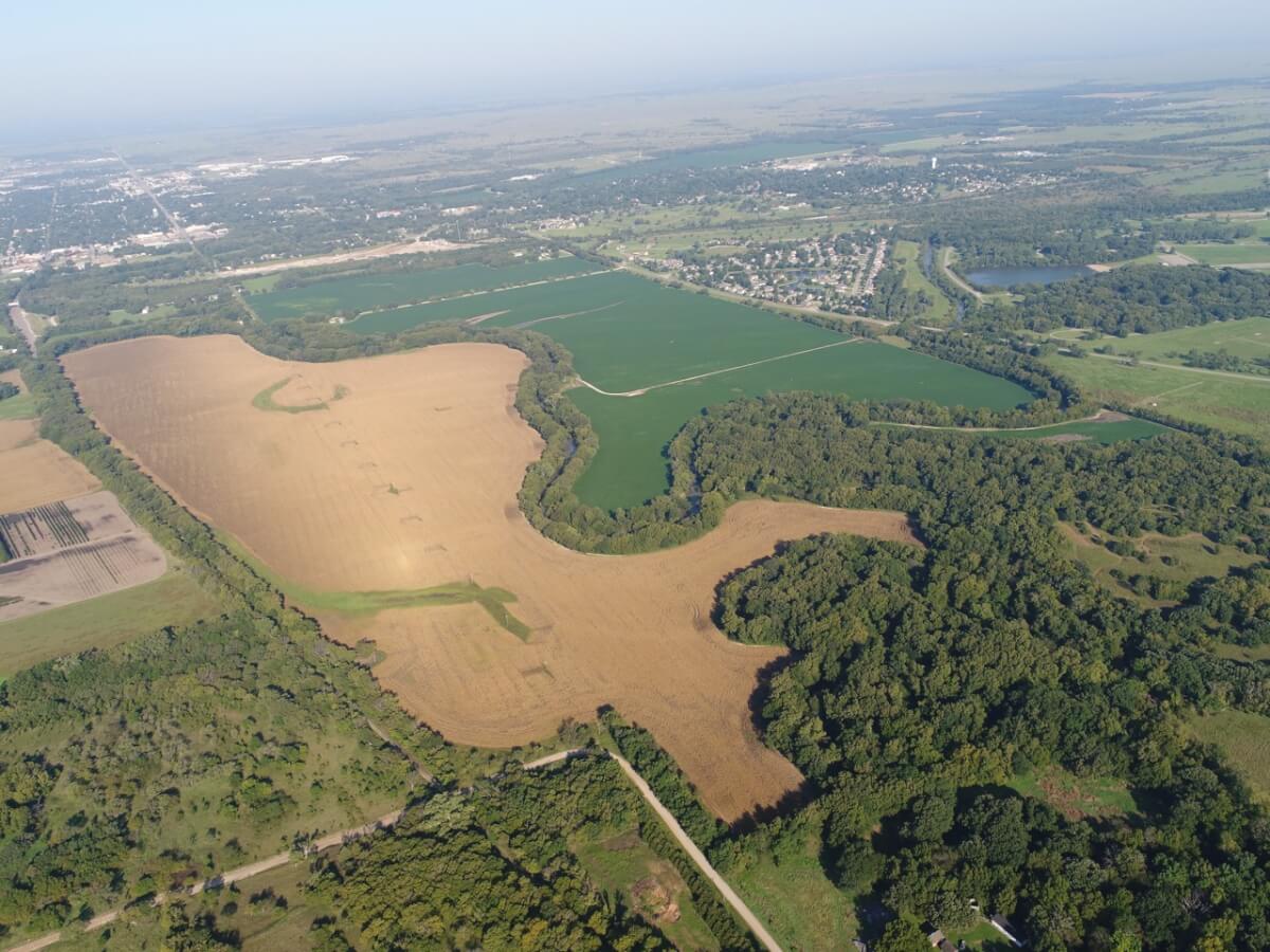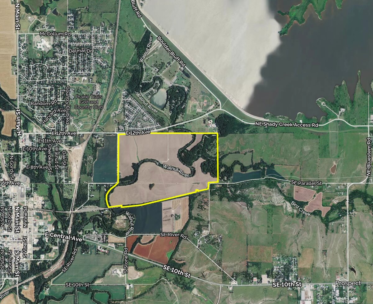 PROPERTY DESCRIPTION: 425+- acres of premium quality Butler County, Kansas land behind the El Dorado Lake. This farm consists of approximately 320 acres of tillable currently planted to Soybeans and Corn, 92% of which is Verdigris Silt Loam Soils. Very productive and very desirable. The balance of the property consists of the Walnut River, Bird Creek, Bemis Creek, and timber. Beautiful old mature Oak, Walnut, Sycamore, and many other varieties line the river and creeks offering an abundance of recreation opportunities. Kansas Whitetail Deer, Turkeys, Geese, and Ducks all frequent this farm. The fishing is unmatched on a privately owned property with Flathead Catfish, Walleye, White Bass, Blue Catfish, Channel Catfish…and of course normal freshwater fish such as Bass, Crappie, and Bluegill. Improvements include a 32′ x 30′ barn for storage and a grain bin. There is a water meter active with the City of El Dorado, and the electric is active with Westar. Invest in the Best! Invest In Land!