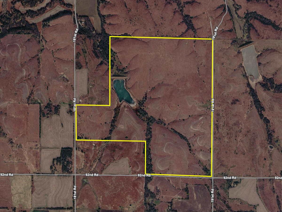 PROPERTY DESCRIPTION: 472.5 acres of extremely high quality cattle grazing pasture, fishing & hunting. Rarely do you see a property with such a high level combination of these characteristics. Located between Burden and Atlanta, this property offers seclusion in the scenic Kansas Flint Hills. The land features excellent cattle grazing pasture, with quality native bluestem grasses and a sizable acreage to support your livestock operation. A standout feature is the impressive 15-acre watershed lake, providing a reliable water source while also serving as the property centerpiece for outdoor enjoyment.