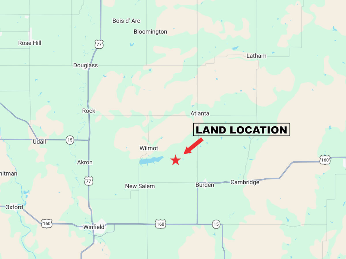 LAND LOCATION FROM BURDEN: 1/2 mile west on HWY 160 to 211th Rd, north 2 miles to 92nd Rd, west 2 miles.