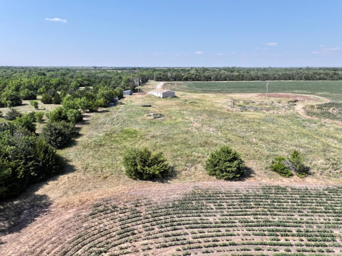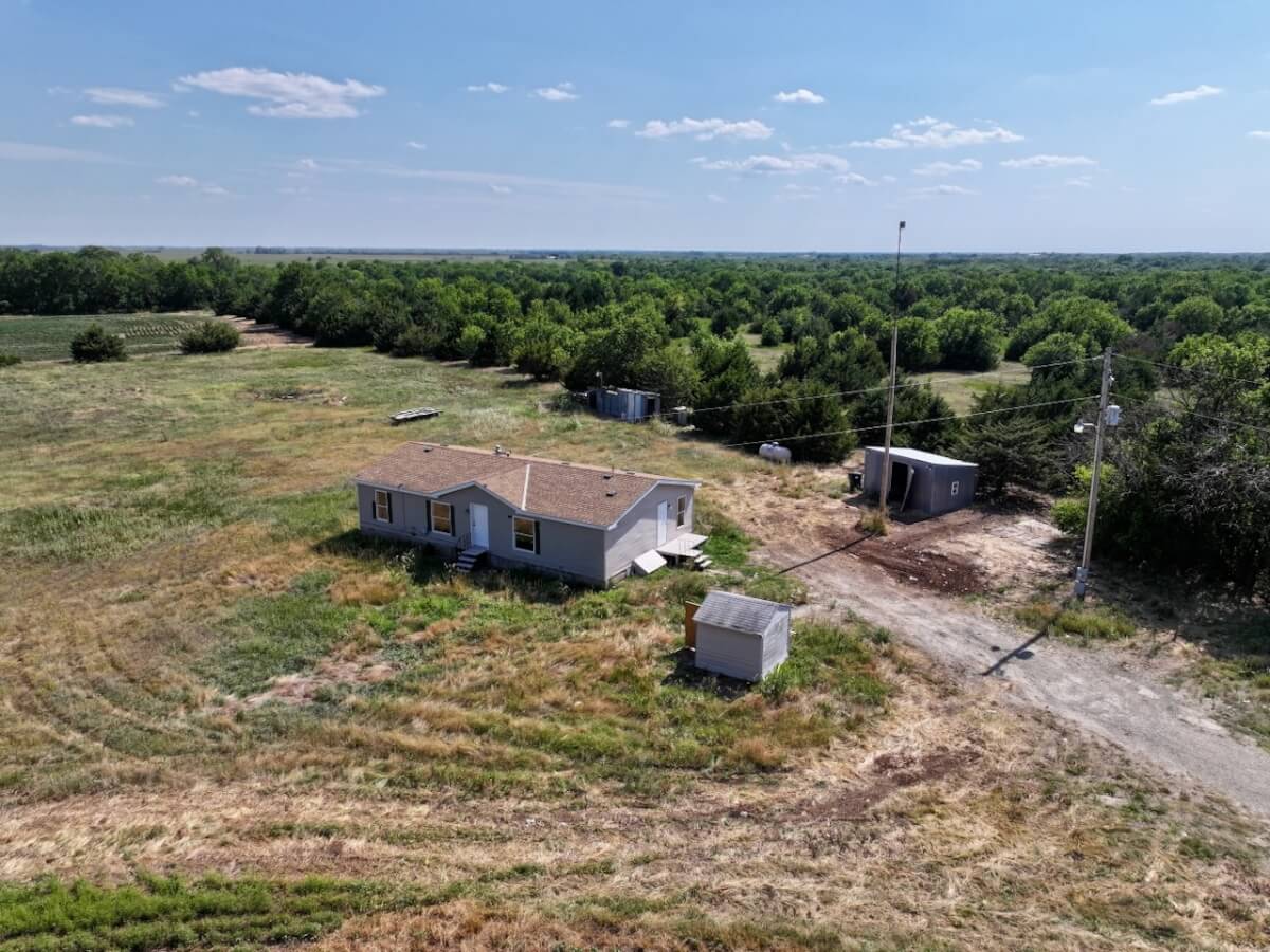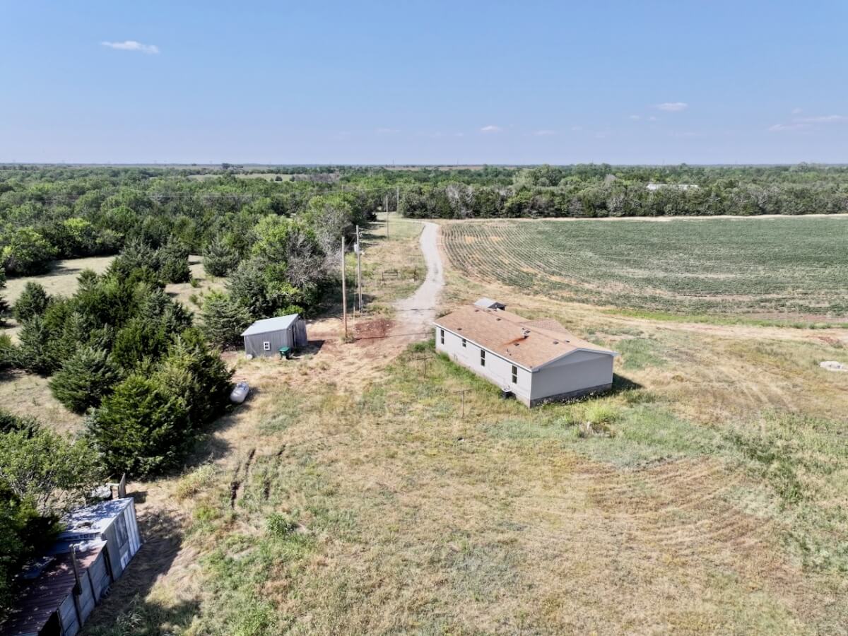 PROPERTY DESCRIPTION: 3 bedroom 2 bath double wide with 1248 square feet lot living area built in 2000 on 9.8 acres east of Douglass in Butler County, Kansas. A portion of the property is tillable farm ground currently plant to cotton! The house is on a water well, lagoon, and propane plus there is a Velocity tower in place. A good portion of the interior has been recently remodeled. There are a couple of misc. building that have some utility. With a good thick pocket of trees at both the north and south end, and a good amount of trees all along the west, this acreage offers some hunting and recreation opportunities. There is an additional 30.1 acre adjoining this property to the east that is also available!