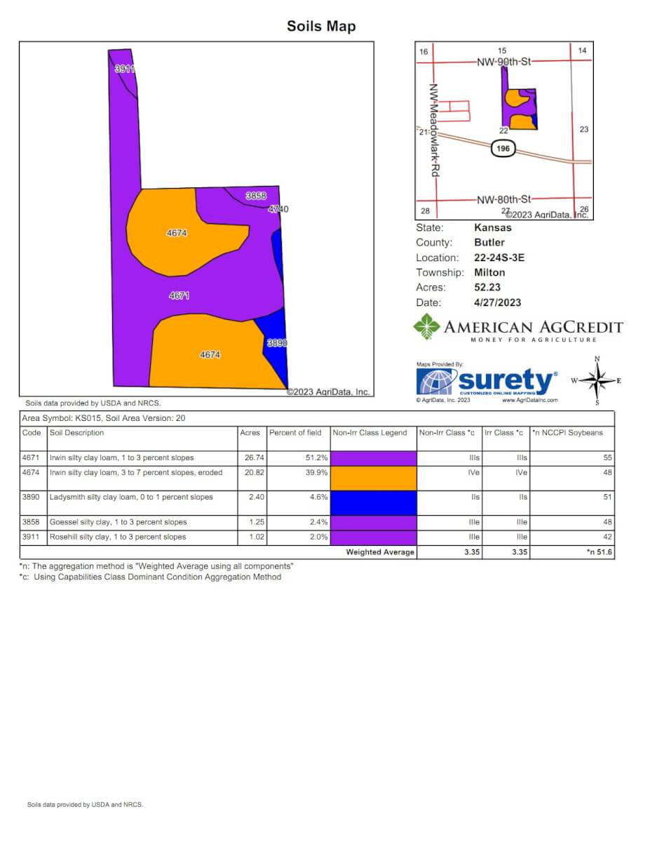 PROPERTY DESCRIPTION: 54.5 acres of tillable farm ground east of Remington High School on NW 90th St. Located between Whitewater and Potwin, this area is well known for high quality and productive farm ground. There is a 2″ rural water line running along the north side of NW 90th St. Soils are 91% Irwin silty clay loam, with the other 9% being Ladysmith silty clay loam, Goessel silty clay, and Rosehill silty clay.