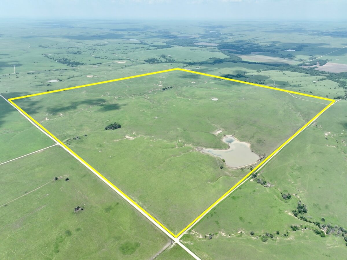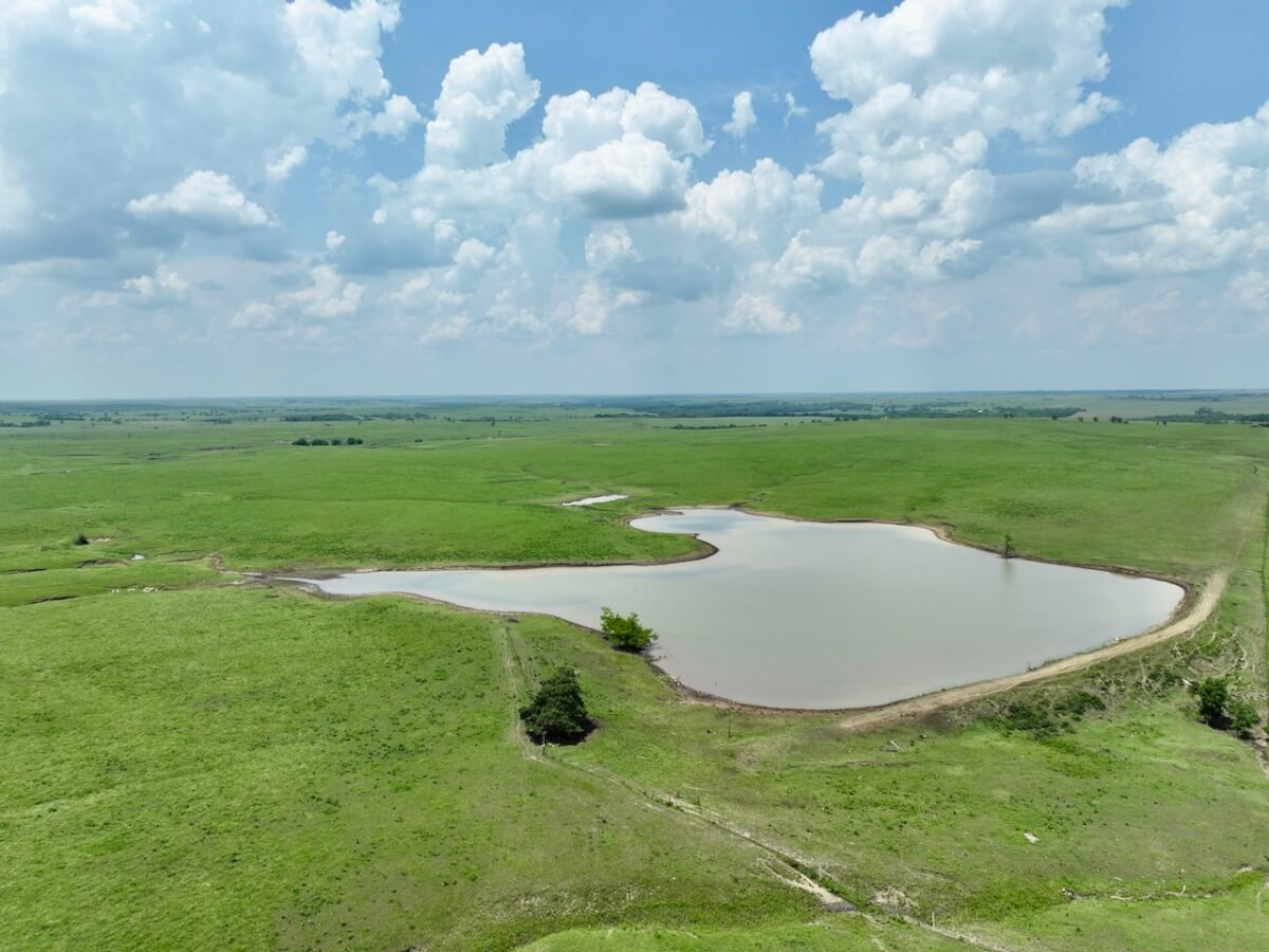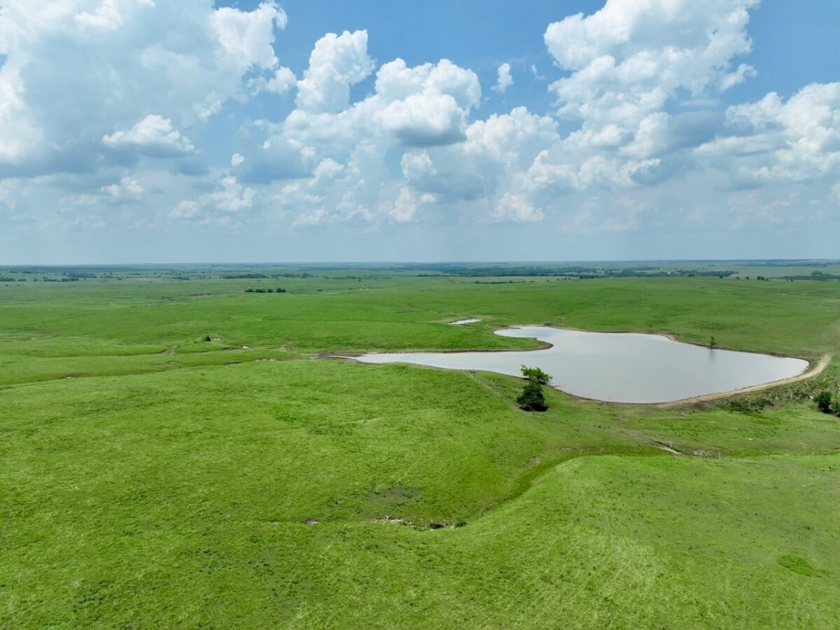 PROPERTY DESCRIPTION: 595 acres of native Flint Hills pasture west of Madison in Greenwood County, Kansas. Water is provided by an 8 1/2 acre pond, another small pond, and multiple wet weather draws. The large pond is stocked with fish including largemouth bass and channel catfish, an added recreation bonus to this high quality cattle grazing opportunity. Perimeter fences around the property consist of steel posts and 5 strands of barbed wire. There is a set of livestock working pens centrally located at the south end of the property. Access is provided by a good township gravel road all along the south boundary and a minimal maintenance road along the east boundary.