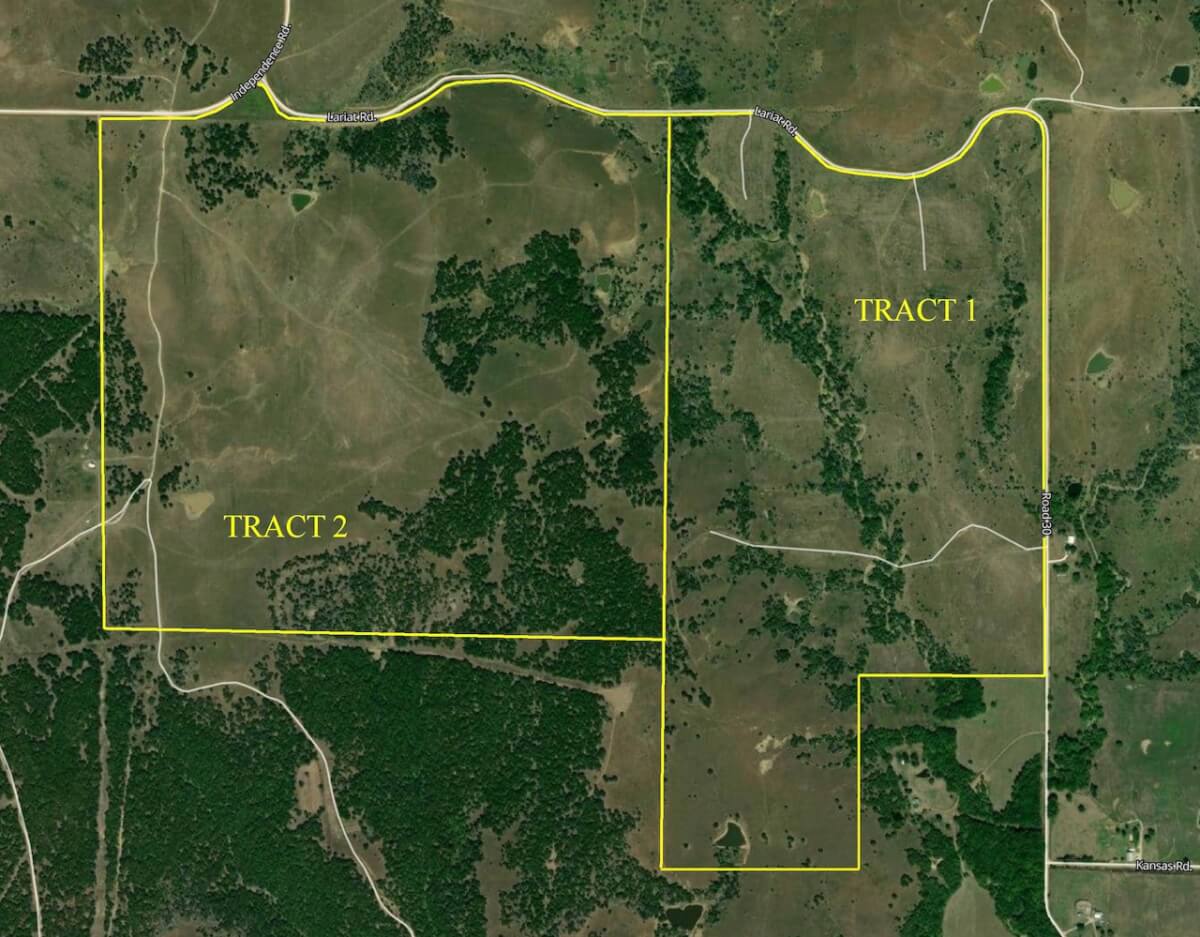 TRACT 2 LEGAL DESCRIPTION: All that part of the Southwest Quarter Lying South of the County Road in Section 19, Township 33 South, Range 13 East of the 6th P.M. AND All that part of the Southeast Quarter of the Southeast Quarter lying South of Independence and Lariat Roads in Section 24, Township 33 South, Range 12 East of the 6th P.M. AND The East Half of the Northeast Quarter and the East Half of the Southeast Quarter of Section 25, Township 33 South, Range 12 East of the 6th P.M., LESS AND EXCEPT a tract described as: Beginning at the Southwest corner of the Southeast Quarter of the Southeast Quarter of said Section 25, thence N 01o49’34” W, along the West line of the East Half of the Southeast Quarter, a distance of 1,664.38 feet, thence N 87o24’26” E, a distance of 452.78 feet, thence S 87o41’55” E a distance of 490.57 feet, thence N 89o55’44” E to the East line of said Section 25, thence South along said East line to the Southeast corner of said Section 25, thence West along the South line of Section 25 to the Point of Beginning AND The West Half of Section 30 LESS AND EXCEPT a tract described as: Beginning at the Southwest corner of said Section 30, thence N 88o01’54” E, along the South line of said Section 30 to the Southwest corner of the Southeast Quarter, thence N 01o45’20” W, a distance of 1,562.78 feet, thence S 89o55’44” W to the West line of the Southwest Quarter of Section 30, thence S along said West line to the Point of Beginning all situated in Chautauqua County, Kansas.