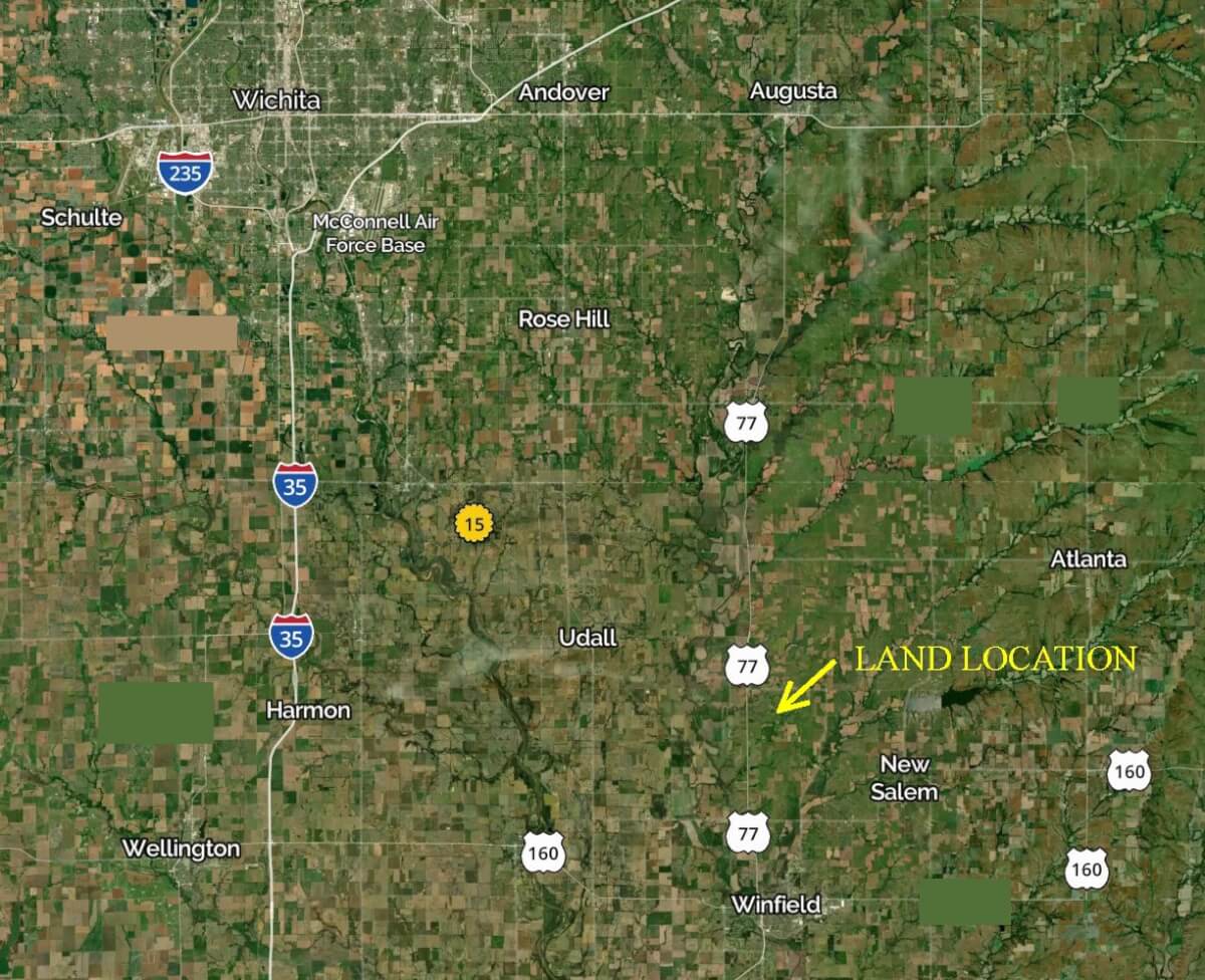 LAND LOCATION: From Winfield Kansas, north on HWY 77 5 1/2 miles to 102nd Rd, east to 91st, north 1 mile to the property.
