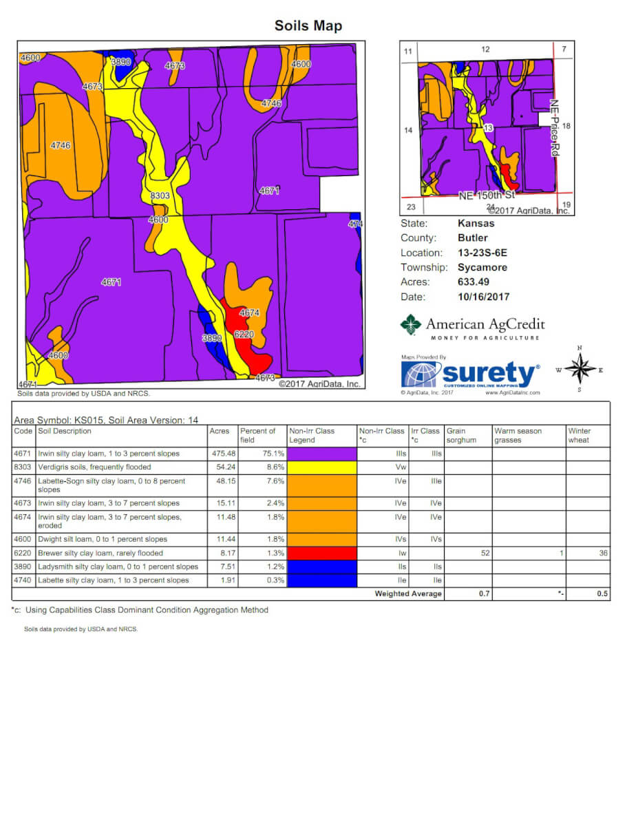 LAND DESCRIPTION: 633.1 acres consisting of approximately 45 acres of native pasture, 310 acres of tillable, and 192 acres of brome. The balance of the property is timber and improvements. The current program works nicely to rotate and winter cattle on the brome and row crop stalks. Water is provided by water wells and 2 ponds. Great agriculture production land with the added bonus of excellent hunting. Kansas Whitetail Deer, Turkeys, and Quail are frequently viewed on the property. With tillable ground sitting on the edge of big Flint Hills pasture country, the Prairie Chicken population is a plentiful as it is anywhere. Cassoday Kansas is known as the Prairie Chicken Capitol of the World.