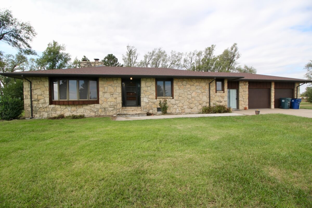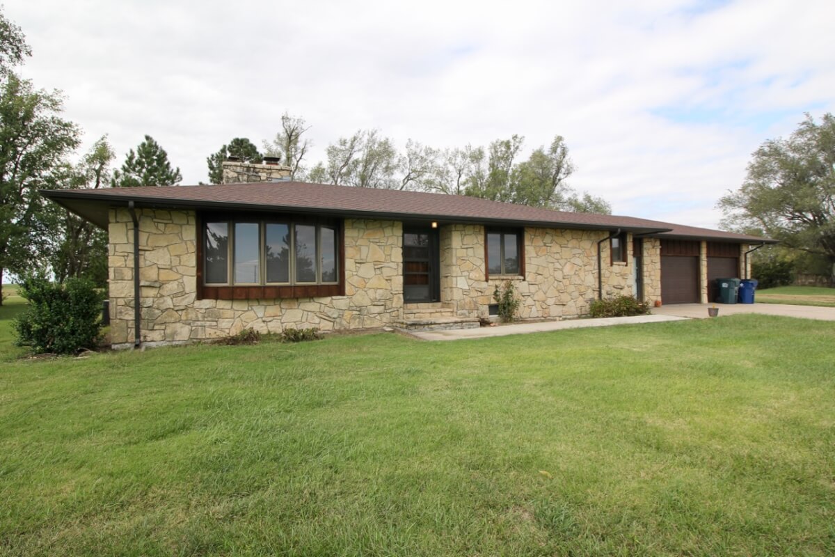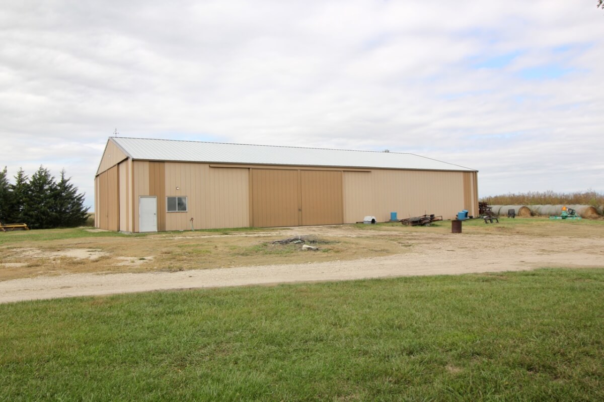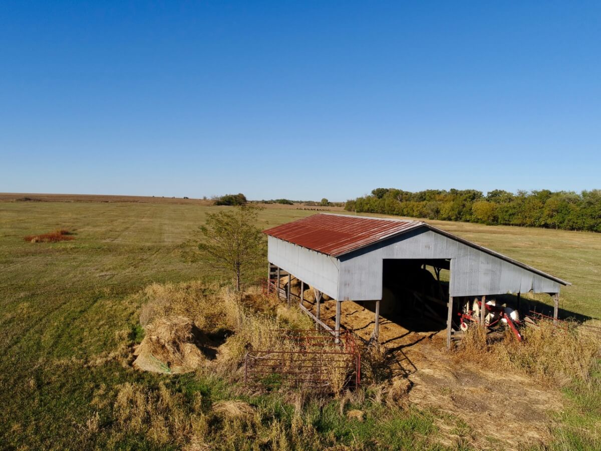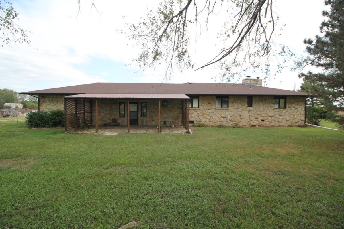 IMPROVEMENTS: 3 bedroom 2 bath Native Limestone house built in 1983 with 1440 square feet of above ground finished living area. The main floor has a kitchen/dining room combo, large living room, fireplace, and laundry room. There is a nice enclosed patio between the house and 2 car garage. The basement has a living area, good storage, and some potential bedroom areas. Buildings include a 96′ x 54’metal building with mostly concrete floor and other miscellaneous hay barns and sheds. The house is on electric, water well, and lagoon.