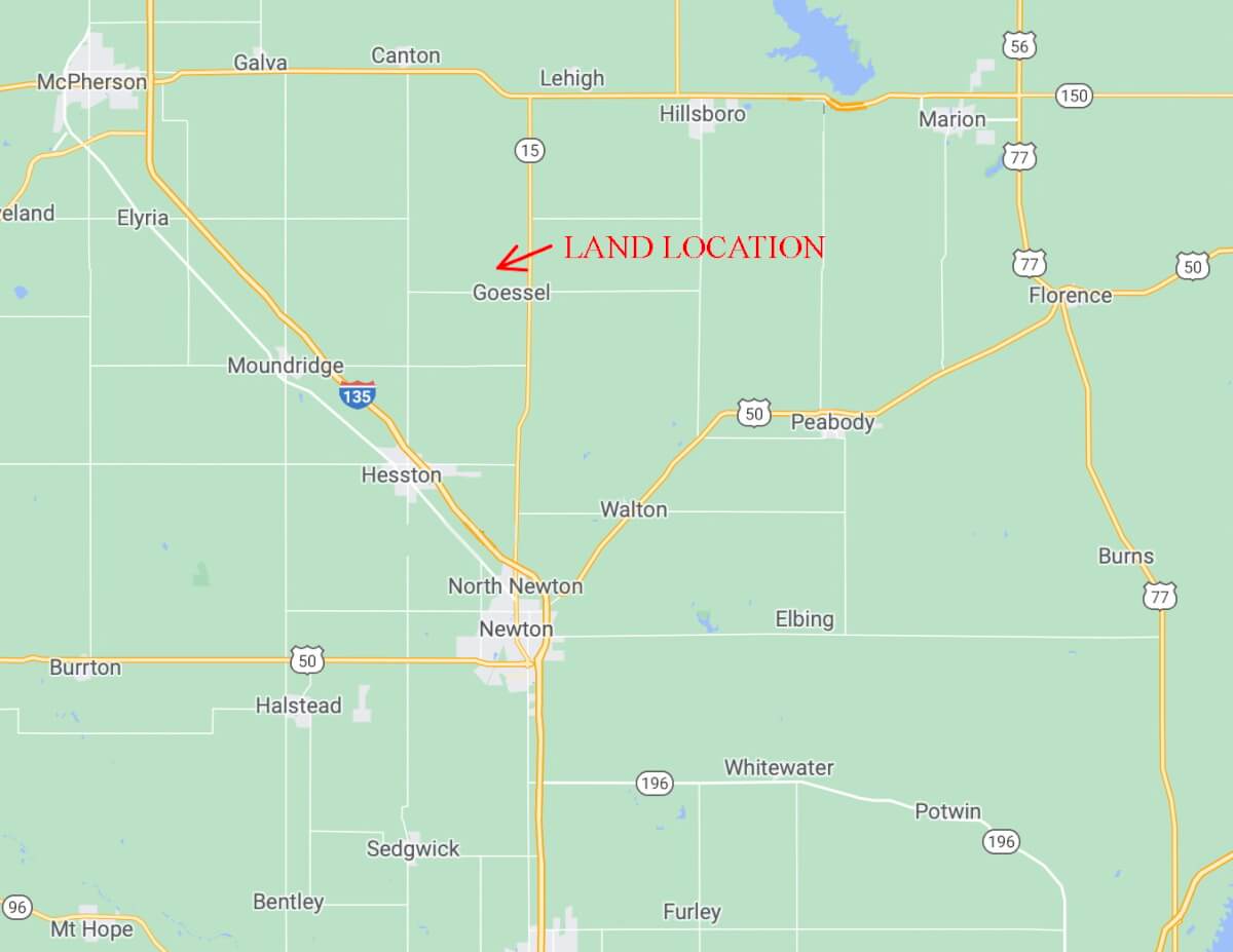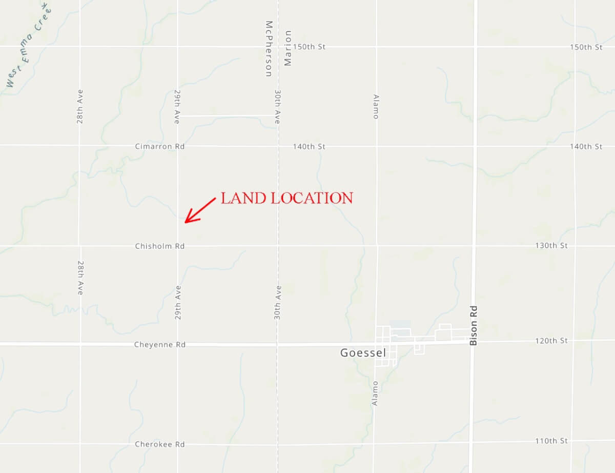 LAND LOCATION: From Goessel Kansas, west 2 miles on 120th St (becomes Cheyenne Rd) to 29th Ave, north 1 1/4 mile to the property.