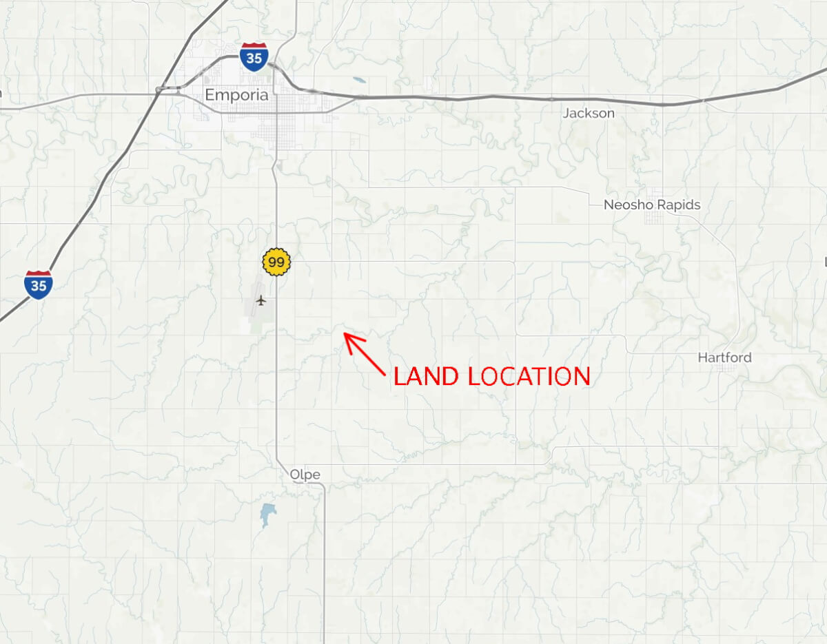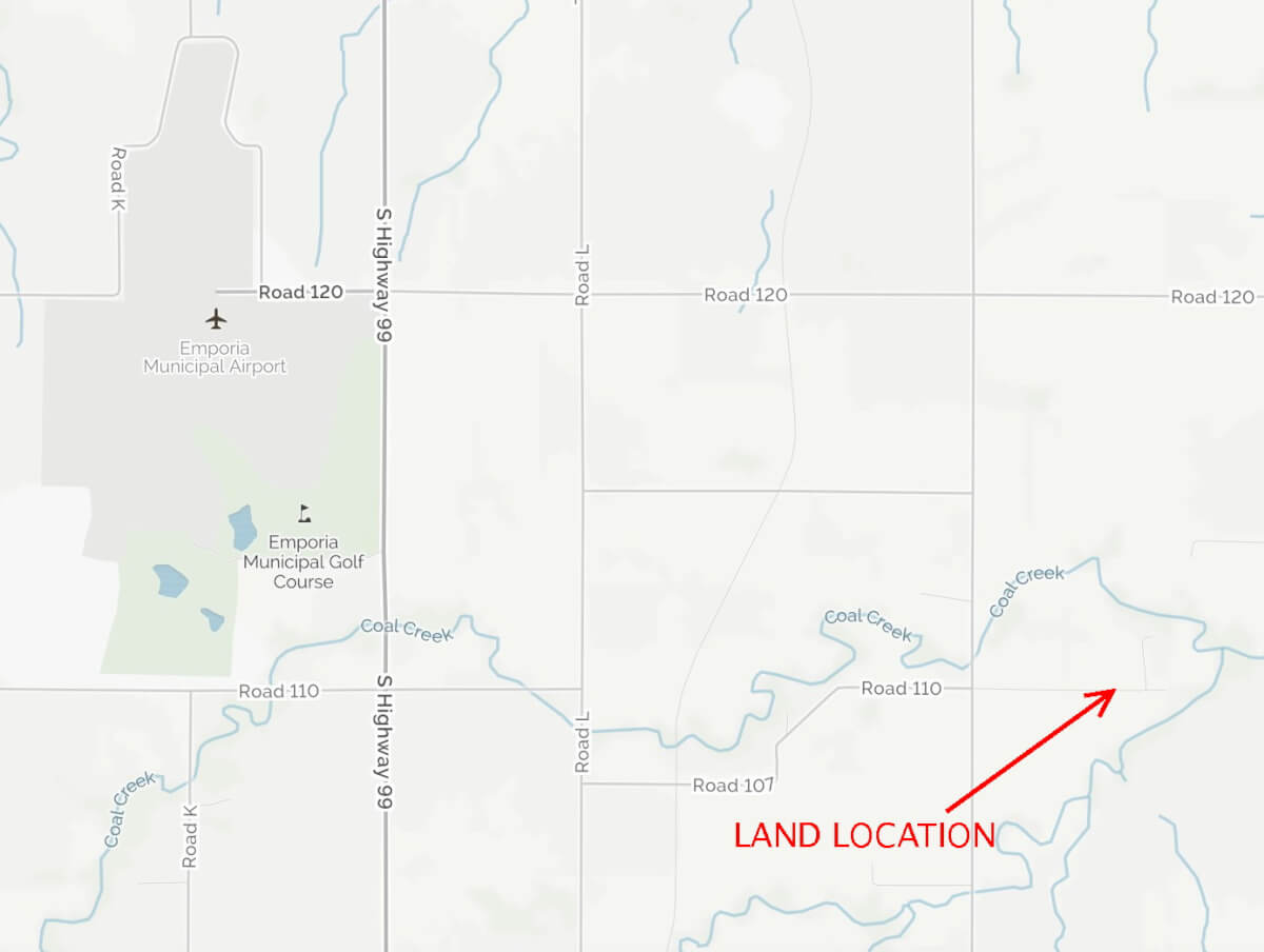 LAND LOCATION: From HWY 99 between Emporia and Olpe, East on Road 110 to L Rd, jog South back to Road 110, East to the property.