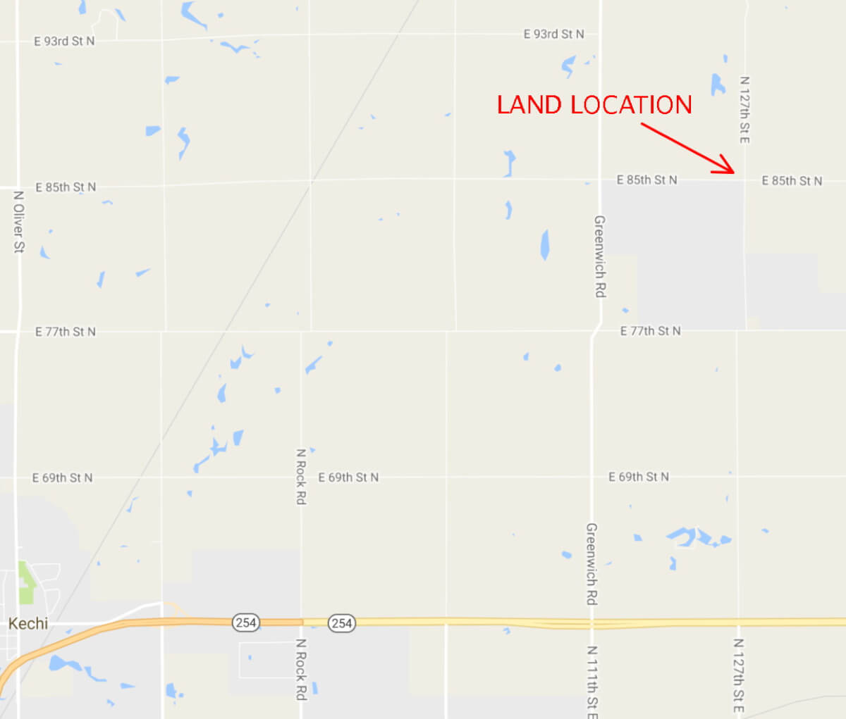 LAND LOCATION: From HWY 254 between Kechi and Benton, 3 miles North on Greenwich Rd to 85th St N, 1/2 mile East.