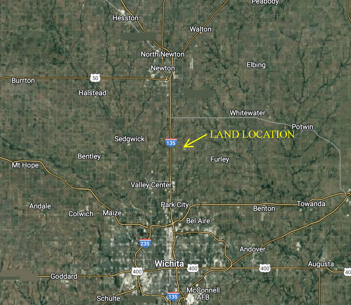 LAND LOCATION: From 135 north of Wichita, east on 125th St 1 1/2 miles to Hillside, south 1/2 mile to the property.