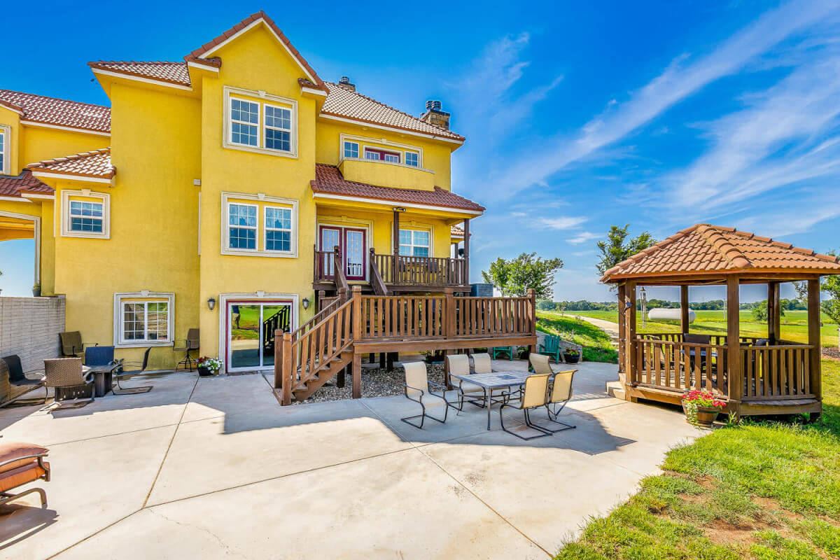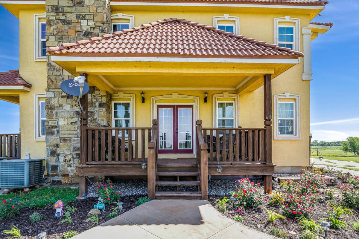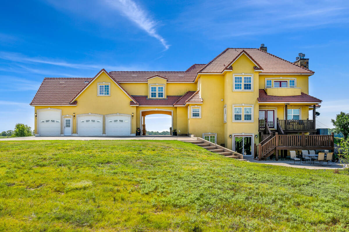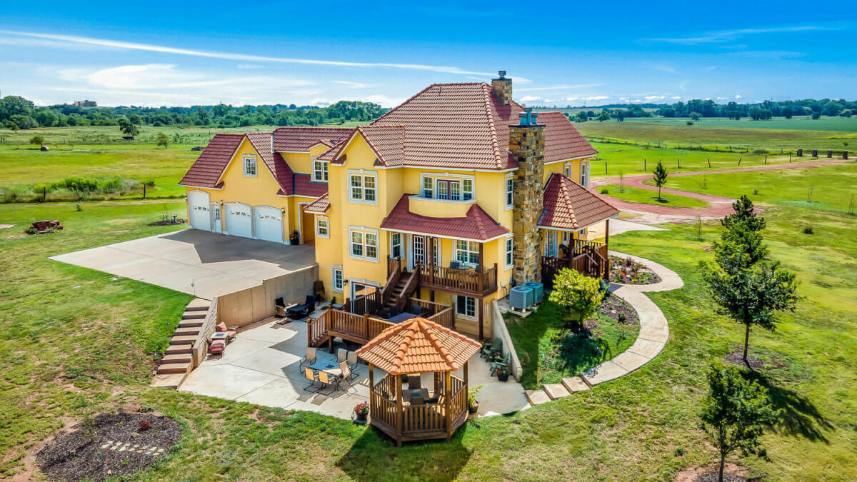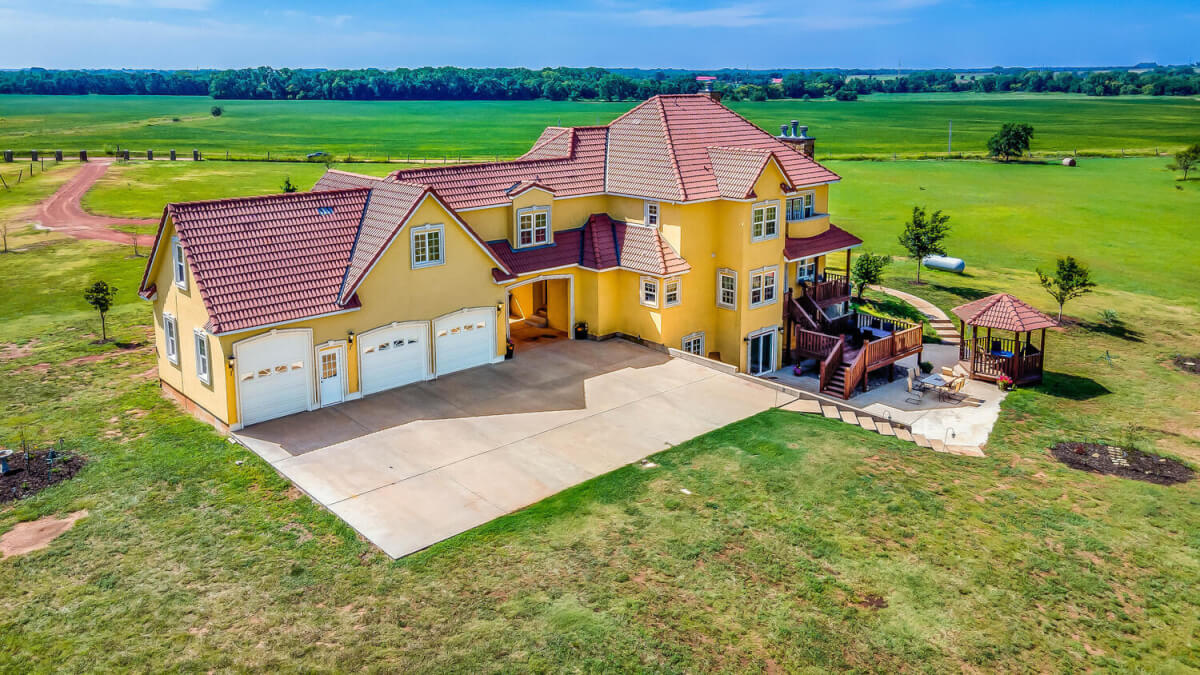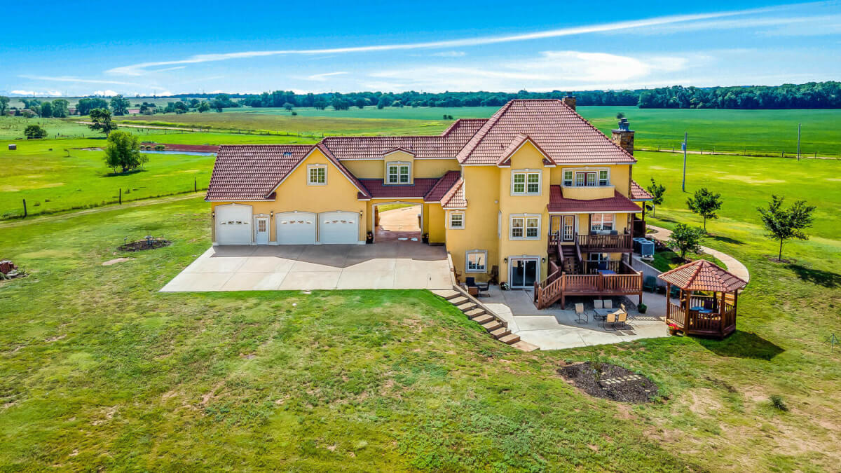 PROPERTY DESCRIPTION: This sprawling home on 58 +/- acres near Murdock, Kansas, is just 40 minutes from the Wichita airport! The impressive home has over 5,500 square feet, has 6 bedrooms, 4 full bathrooms, and 2 half baths, plus an attached oversized 3 car garage with a drive through overhang. The beautiful stucco and masonry siding, and the tile roof are very complimentary of each other. Walking through the front door, you will immediately notice the gorgeous stone archway, a hearth room with wood burning fireplace to your left, and a formal dining room to your right. Keep going straight past the stairway to enter into the living room on your left, with another wood burning fireplace, and the huge kitchen with tons of seating area on your right. The floors are mainly hardwood throughout, with touches of marble flooring in the entry and hallway, and tile in the kitchen. The kitchen has granite countertops, a pantry, a double door stainless steel refrigerator, an island, and a desk. Upstairs, the beauty continues with four bedrooms and three baths, and a gorgeous ensuite bathroom with separate jetted tub, walk-in shower and granite counters. Down in the walk-out basement is two more bedrooms and a bath, plus a beautiful dry bar with more stone features. Walking out back from the basement, you will notice the two-level deck and the gazebo. Even though the pictures are beautiful, they do not do this home justice. You must see this property in person to truly appreciate its uniqueness and beauty!
