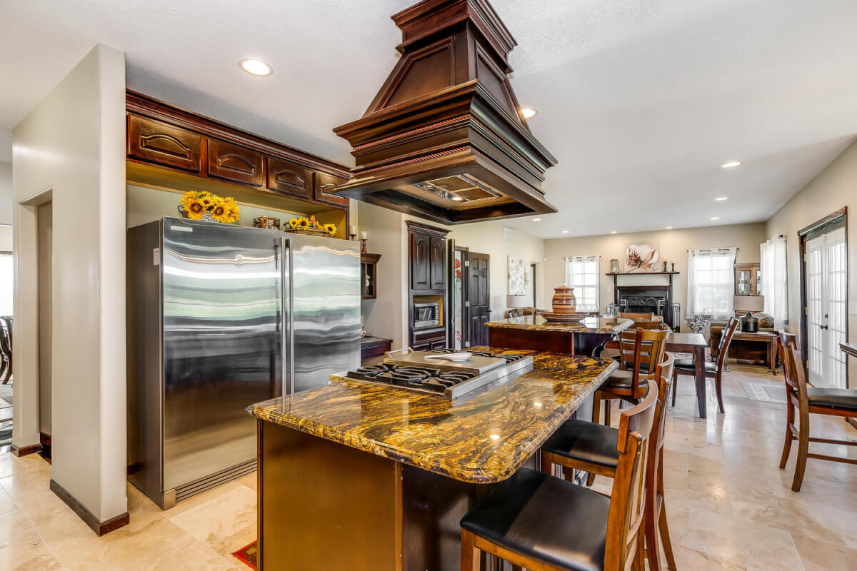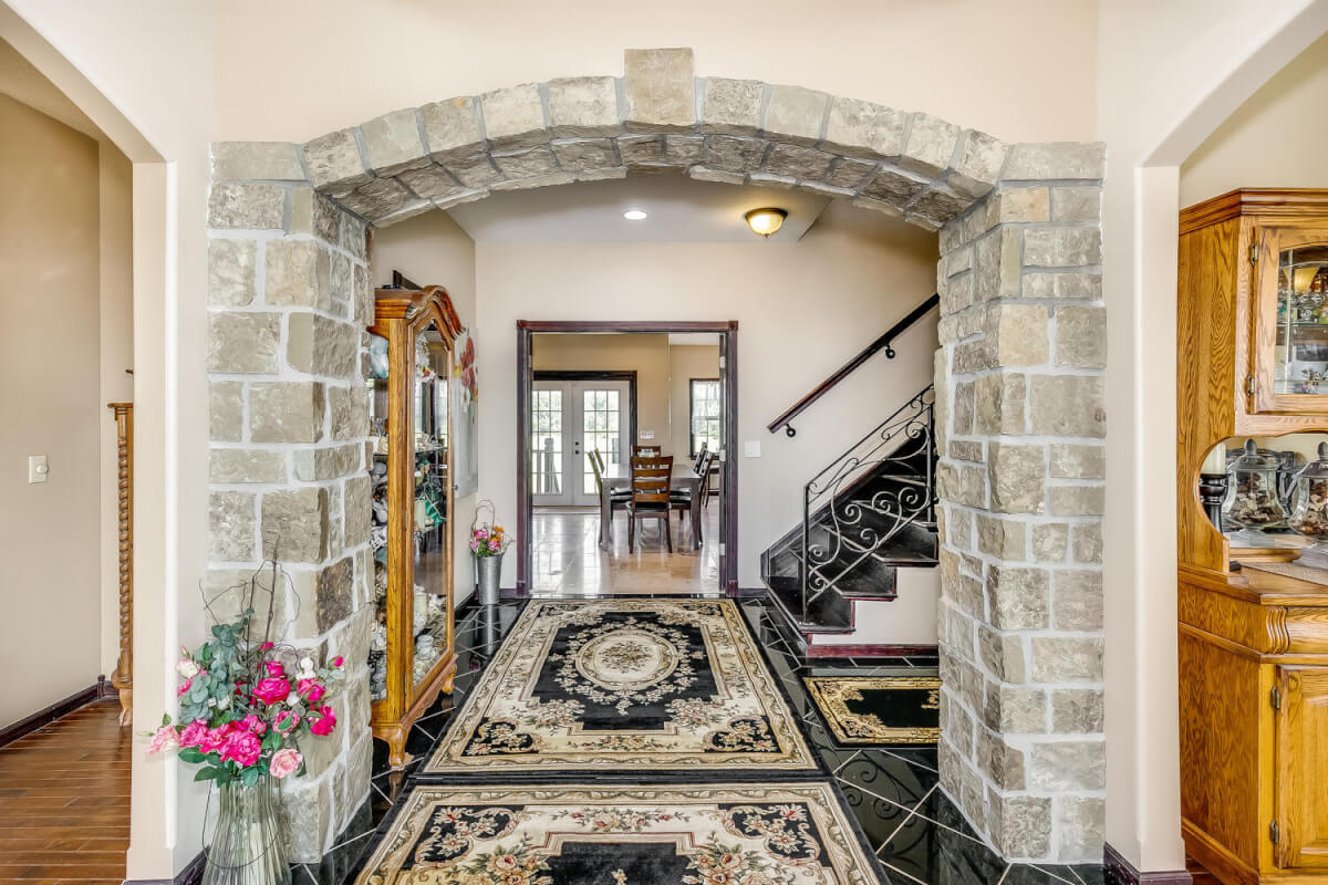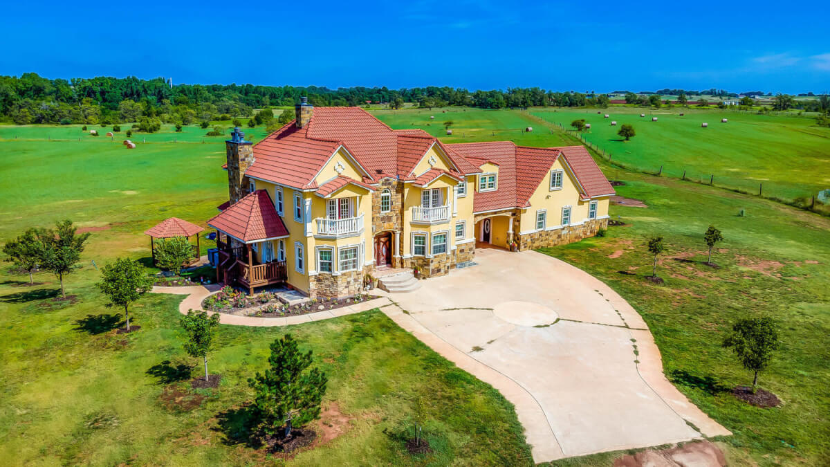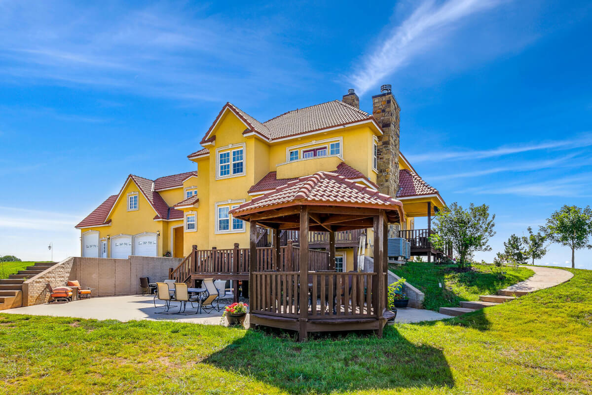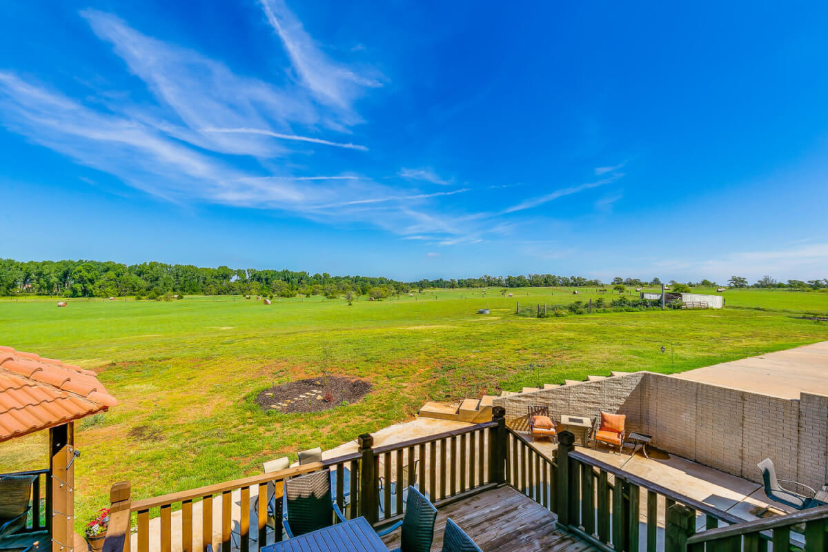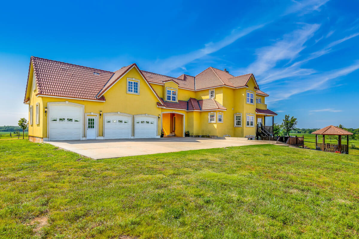 PROPERTY DESCRIPTION: This sprawling home on 58 +/- acres near Murdock, Kansas, is just 40 minutes from the Wichita airport! The impressive home has over 5,500 square feet, has 6 bedrooms, 4 full bathrooms, and 2 half baths, plus an attached oversized 3 car garage with a drive through overhang. The beautiful stucco and masonry siding, and the tile roof are very complimentary of each other. Walking through the front door, you will immediately notice the gorgeous stone archway, a hearth room with wood burning fireplace to your left, and a formal dining room to your right. Keep going straight past the stairway to enter into the living room on your left, with another wood burning fireplace, and the huge kitchen with tons of seating area on your right. The floors are mainly hardwood throughout, with touches of marble flooring in the entry and hallway, and tile in the kitchen. The kitchen has granite countertops, a pantry, a double door stainless steel refrigerator, an island, and a desk. Upstairs, the beauty continues with four bedrooms and three baths, and a gorgeous ensuite bathroom with separate jetted tub, walk-in shower and granite counters. Down in the walk-out basement is two more bedrooms and a bath, plus a beautiful dry bar with more stone features. Walking out back from the basement, you will notice the two-level deck and the gazebo. Even though the pictures are beautiful, they do not do this home justice. You must see this property in person to truly appreciate its uniqueness and beauty!